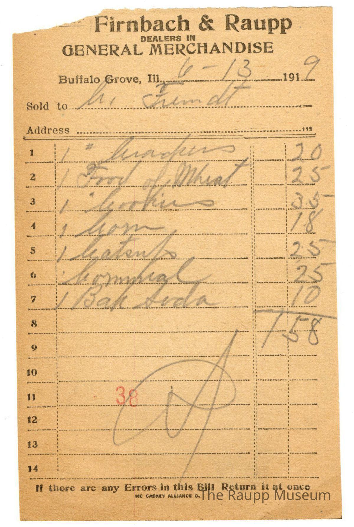 One (1) Firnbach and Raupp store receipt from June 13, 1919. Receipt is rectangular with black printed text and written notes in pencil. The receipt is for C. Fremdt, who bought one # ( pound) crackers for $0.20, one Food of Wheat for $0.25, one # (pound) cookies for $0.35, one corn $0.18, one catsup for $0.25, one cornmeal for $0.25, and one Bak (Baking) Soda for $0.10. Bill total is $1.58. There's a red stamp of 38 close to the bottom, with the bill marked as paid (written as "Pd.").