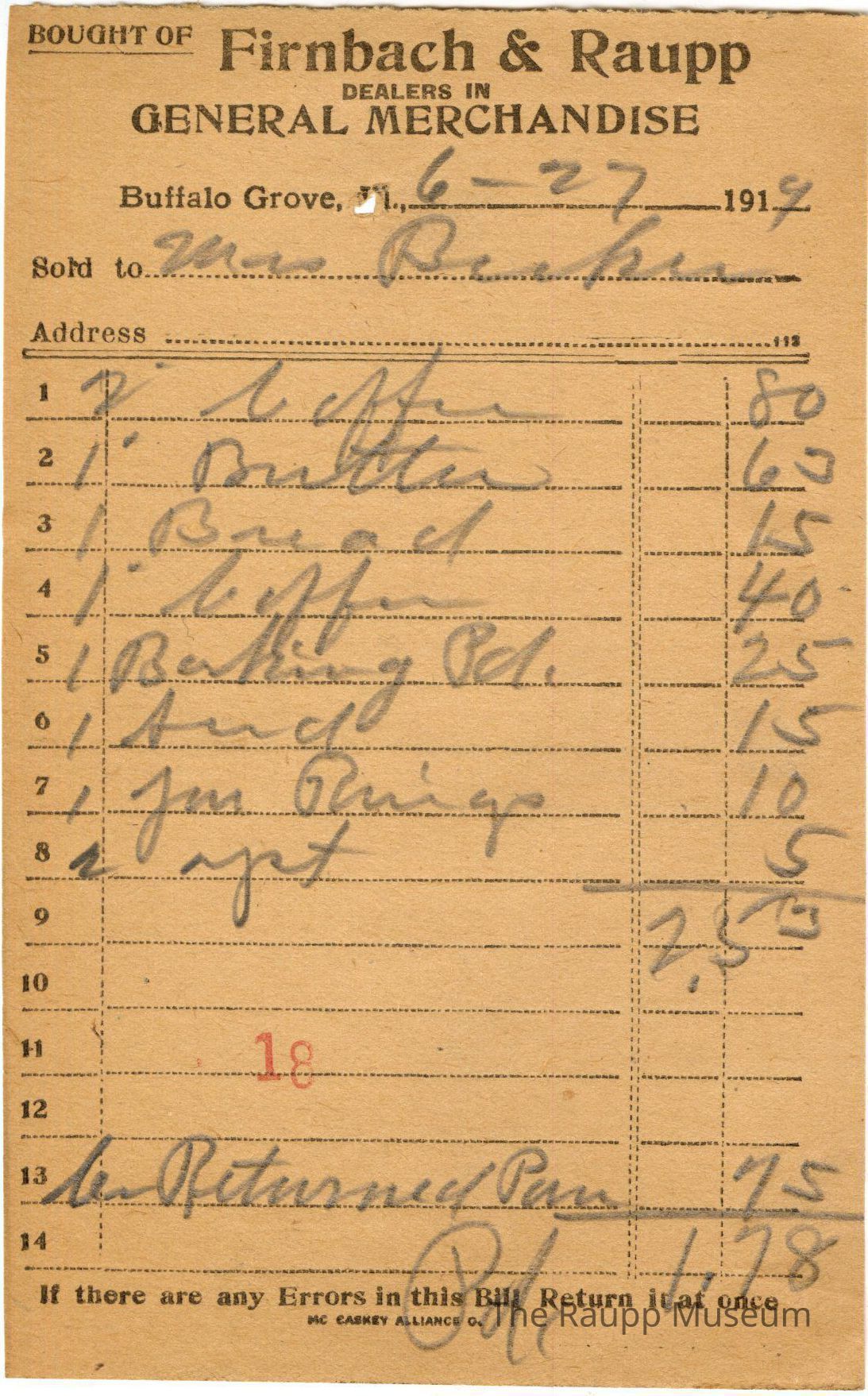 One (1) Firnbach and Raupp store receipt from June 27, 1919. Receipt is rectangular with black printed text and written notes in pencil. The receipt is for Mrs. Becker, who bought two coffee for $0.80, one butter for $0.63, one bread for $0.15, one coffee for $0.40, one baking pd (powder) for $0.25, one seed (?) for $0.15, one jar rings for $0.10, and two yst (yeast) for $0.05. The bill total is $2.53. In addition, Cr. returned pan for a credit of $0.75. The final bill total is $1.78.