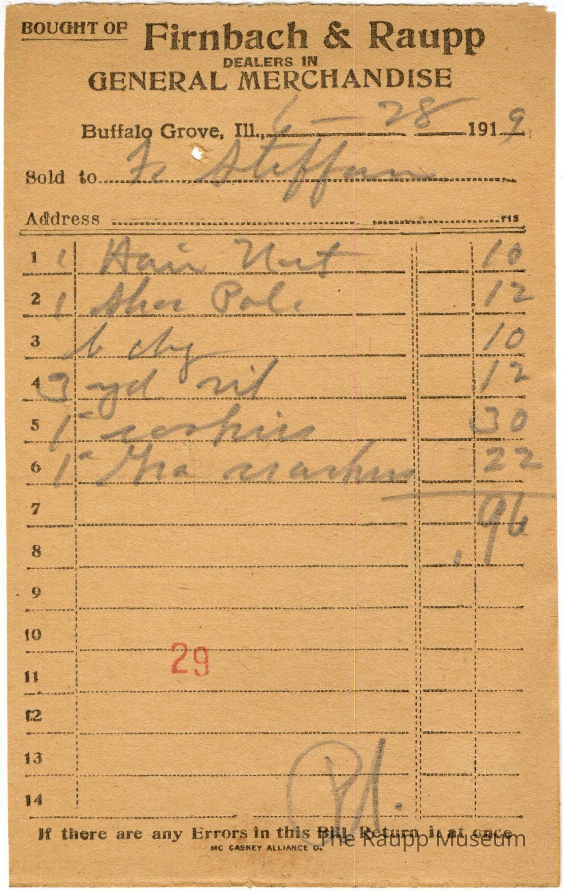 One (1) Firnbach and Raupp store receipt from June 28, 1919. Receipt is rectangular with black printed text and written notes in pencil. The receipt is for F. Steffen, who bought one hair net for $0.10, one shoe pol (polish) for $0.12, cdy (candy) for $0.10, three yd (yard) of (?) for $0.12, one cookie for $0.30, and one gra (graham) crackers for $0.22. The bill total is $0.96.
