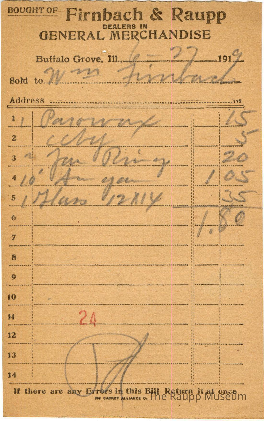 The black text is as follows, Bought of Firnbach and Raupp; Dealers in; General Merchandise; Buffalo Grove Ill.; Sold to; Address; If there are any Errors in this Bill Return it at once; MC CASKEY ALLIANCE O.