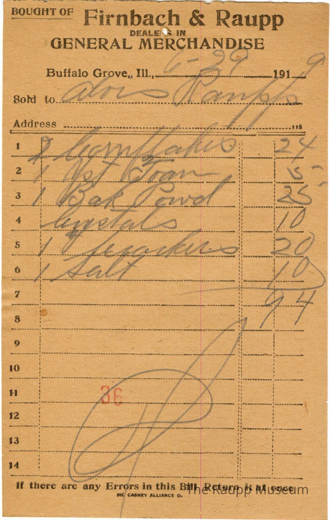 The black text is as follows, Bought of Firnbach and Raupp; Dealers in; General Merchandise; Buffalo Grove Ill.; Sold to; Address; If there are any Errors in this Bill Return it at once; MC CASKEY ALLIANCE O.