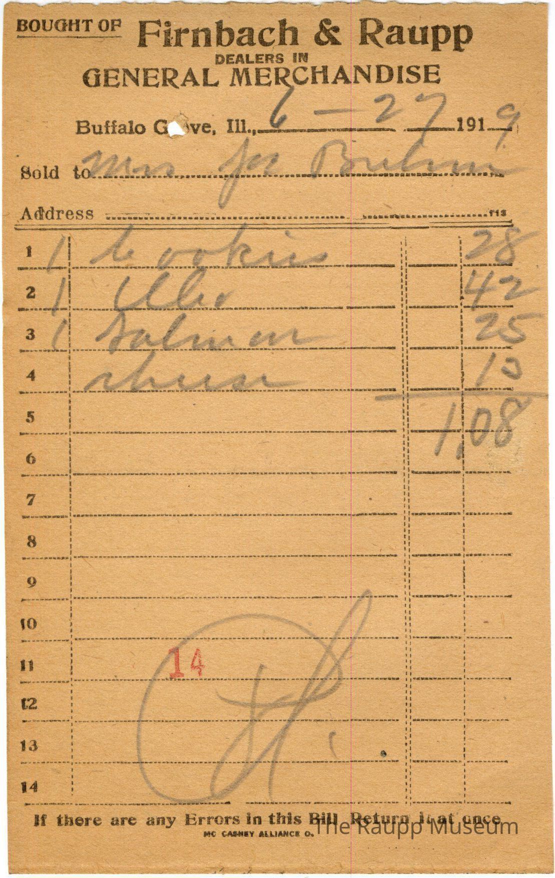 The black text is as follows, Bought of Firnbach and Raupp; Dealers in; General Merchandise; Buffalo Grove Ill.; Sold to; Address; If there are any Errors in this Bill Return it at once; MC CASKEY ALLIANCE O.