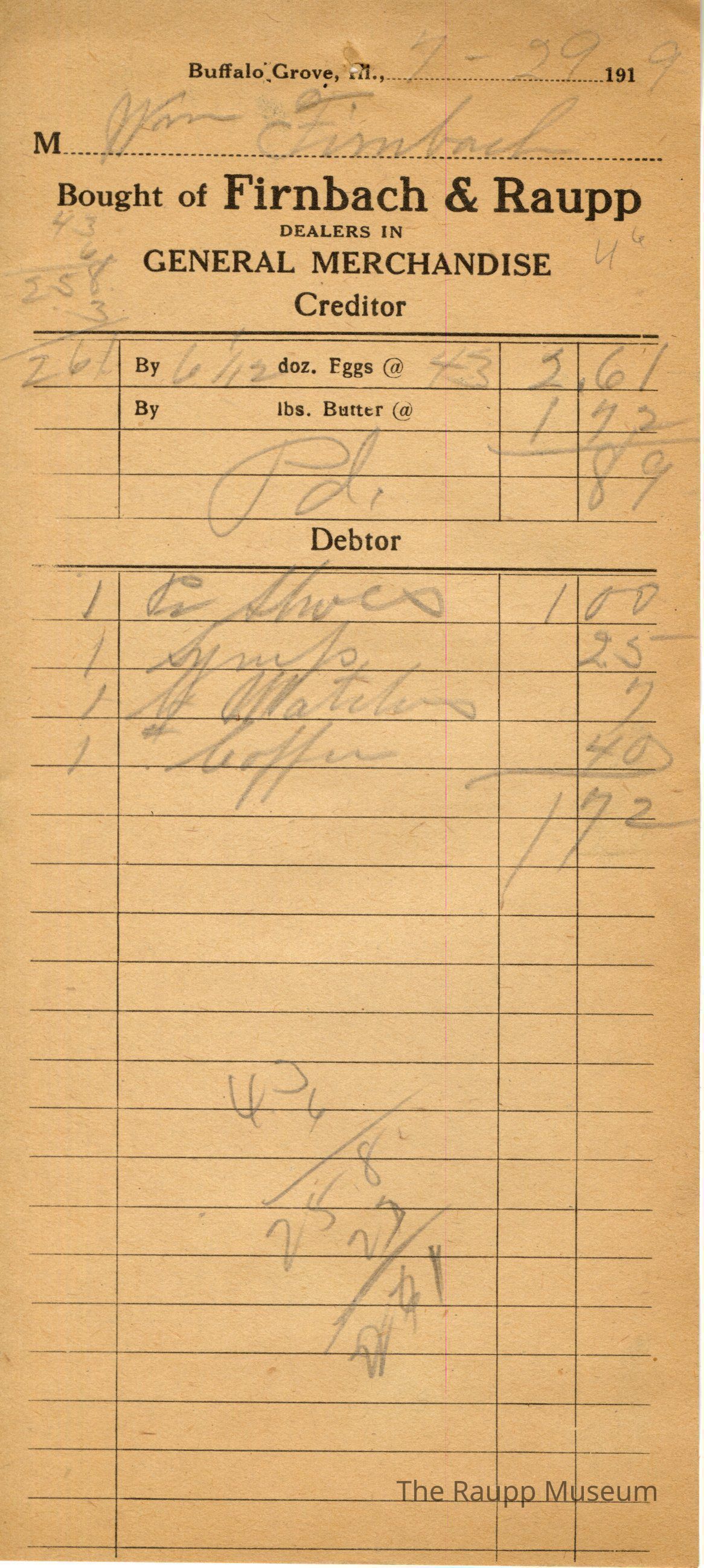 The black text is as follows, from top to bottom: Buffalo Grove, Ill.,; M; Bought of Firnbach & Raupp; DEALERS IN; GENERAL MERCHANDISE; Creditor; By doz. Eggs @; By lbs. Butter @; DebtorArchive Details