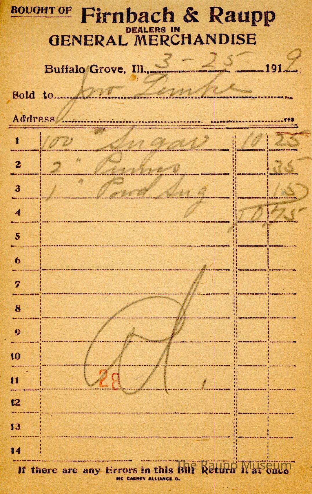 One (1) Firnbach and Raupp store receipt from March 25, 1919. Receipt is rectangular with black printed text and written notes in pencil. The receipt is for J(?) Lemke, who bought 100 pounds of sugar for $10.25, 2 pounds of prunes for $0.35, and 1 pound of sugar for $0.15. Bill total was $10.75. There is a red "28" stamp near the bottom of the bill. The bill is marked as paid.