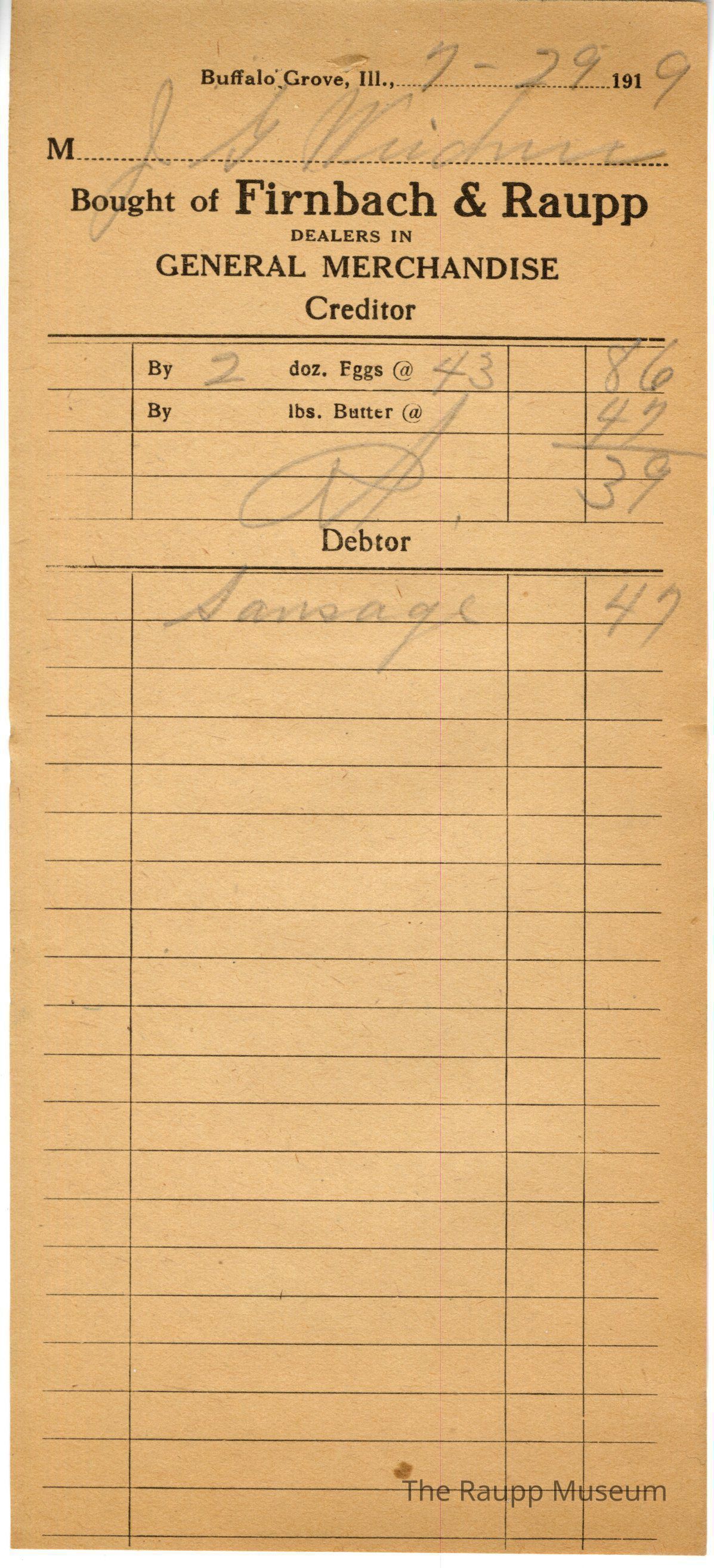One (1) Firnbach and Raupp store receipt from July 29, 1919. Receipt is rectangular with black printed text and written notes in pencil. The receipt is for J.G. Weidner, who sold 2 dozen eggs at $0.43 for a total of $0.86. He bought sausage for $0.47. Spending total was $0.47. After subtracting the spending total from the money earned from the eggs, Weidner received $0.39. There is a handwritten symbol above the "Debtor" section of the receipt.