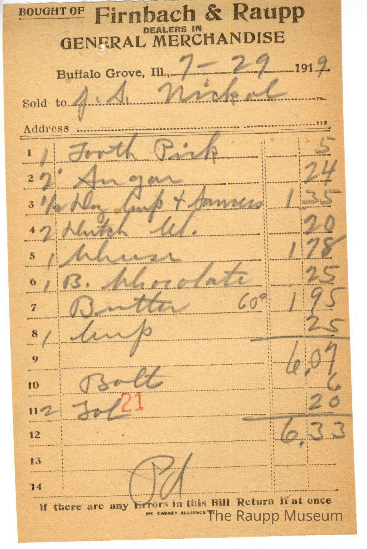The black text is as follows, from top to bottom: Bought of Firnbach & Raupp; DEALERS IN; GENERAL MERCHANDISE; Buffalo Grove, Ill; Sold to; Address; If there are any Errors in this Bill, Return it at once; Mc Caskey Alliance CoArchive Details