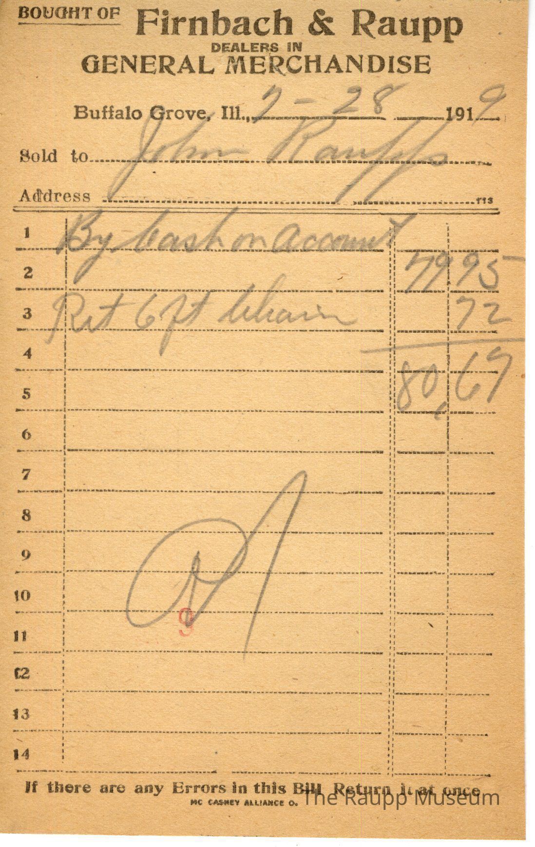 The black text is as follows, from top to bottom: Bought of Firnbach & Raupp; DEALERS IN; GENERAL MERCHANDISE; Buffalo Grove, Ill; Sold to; Address; If there are any Errors in this Bill, Return it at once; Mc Caskey Alliance CoArchive Details