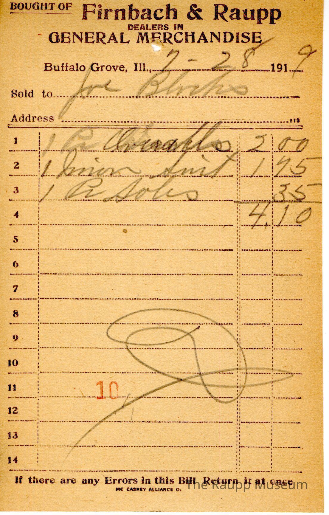 The black text is as follows, from top to bottom: Bought of Firnbach & Raupp; DEALERS IN; GENERAL MERCHANDISE; Buffalo Grove, Ill; Sold to; Address; If there are any Errors in this Bill, Return it at once; Mc Caskey Alliance CoArchive Details