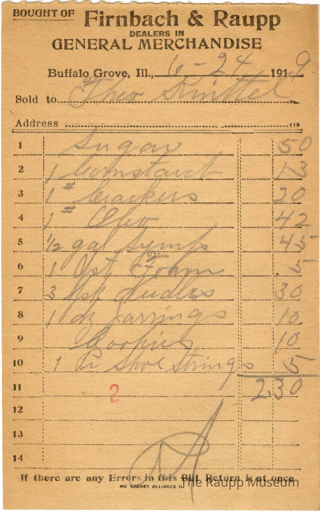 One (1) Firnbach and Raupp store receipt from June 24, 1919. Receipt is rectangular with black printed text and written notes in pencil. The receipt is for Theo Knittel, who bought sugar for $0.50, one cornstarch for $0.13, one # (pound) of crackers for $0.20, one # (pound) of oleo for $0.42, one-half gal (gallon) of syrup for $0.45, one yst (yeast) foam for $0.05, three pk (pack) of needles for $0.30, one dz (dozen) jarrings for $0.10, cookies for $0.10, and one pr (pair) of shoe strings for $0.05. The bill total is $2.30.