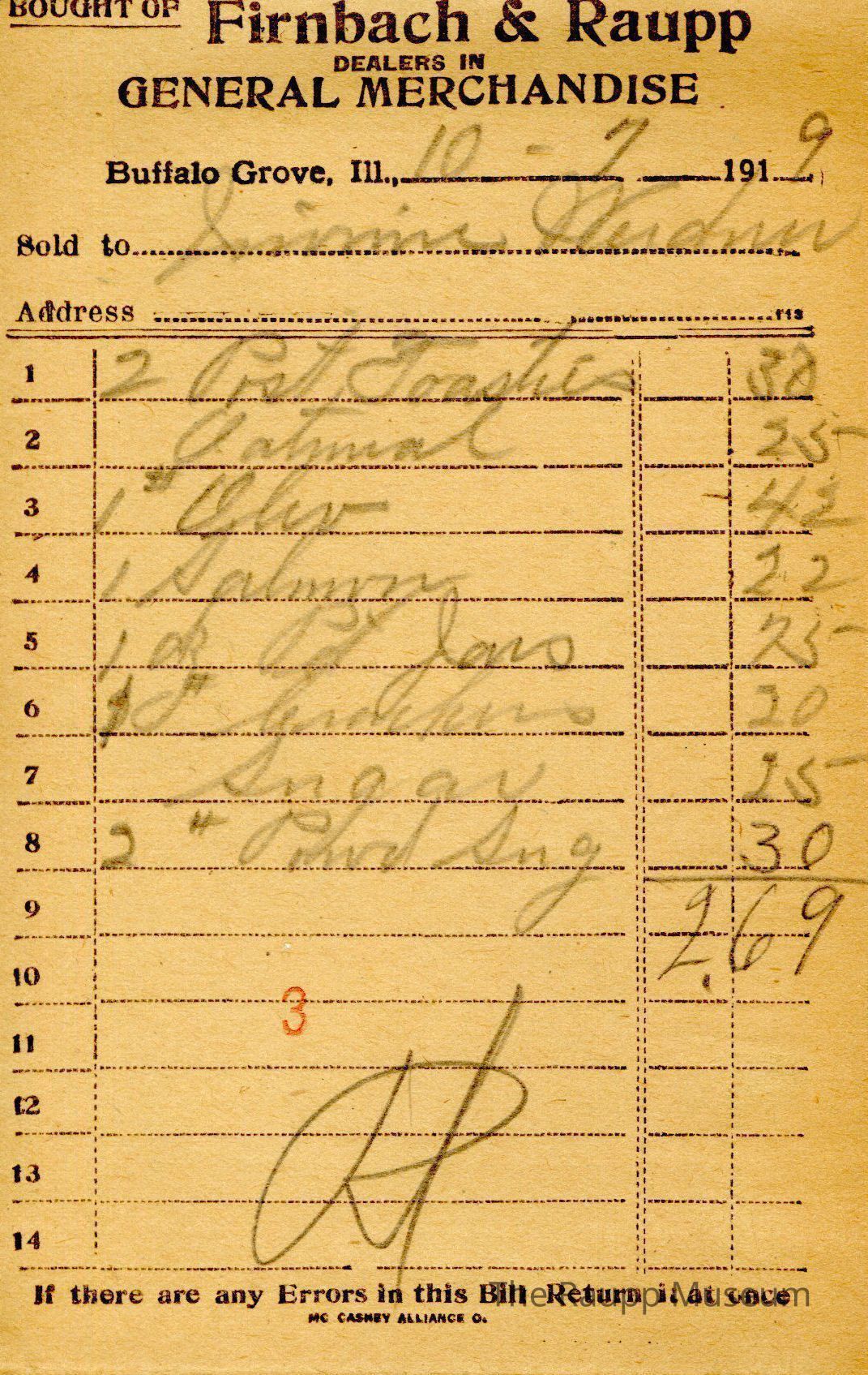 One (1) Firnbach and Raupp store receipt from October 7, 1919. Receipt is rectangular with black printed text and written notes in pencil. The receipt is for Lorimie Weidner (?), who bought two Post Toasties for $0.30, oatmeal for $0.25, one pound of oleo for $0.42, one salmon for $0.22, one dozen pint jars for $0.75, one pound of crackers for $0.20, sugar for $0.25, and two pounds of powdered sugar for $0.30. The bill total is $2.69 and the receipt is marked as paid. A red stamp of 3 is located towards the bottom of the page. The text from top to bottom is: BOUGHT OF Firnbach & Raupp; DEALERS IN GENERAL MERCHANDISE; Buffalo Grove, Ill.; Sold to; Address; If there are any Errors in this Bill Return It at once; MC CASKEY ALLIANCE O.Archive Details
