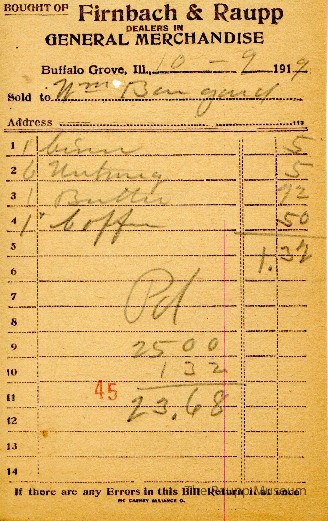 One (1) Firnbach and Raupp store receipt from October 9, 1919. Receipt is rectangular with black printed text and written notes in pencil. The receipt is for Wm. Beugard, who bought one biner (?) for $0.05, six nutmeg for $0.05, one butter for $0.72, and one pound of coffee for $0.50. The bill total is $1.32 and the receipt is marked as paid. A red stamp of 45 is located towards the bottom of the page. The text from top to bottom is: BOUGHT OF Firnbach & Raupp; DEALERS IN GENERAL MERCHANDISE; Buffalo Grove, Ill.; Sold to; Address; If there are any Errors in this Bill Return It at once; MC CASKEY ALLIANCE O.Archive Details