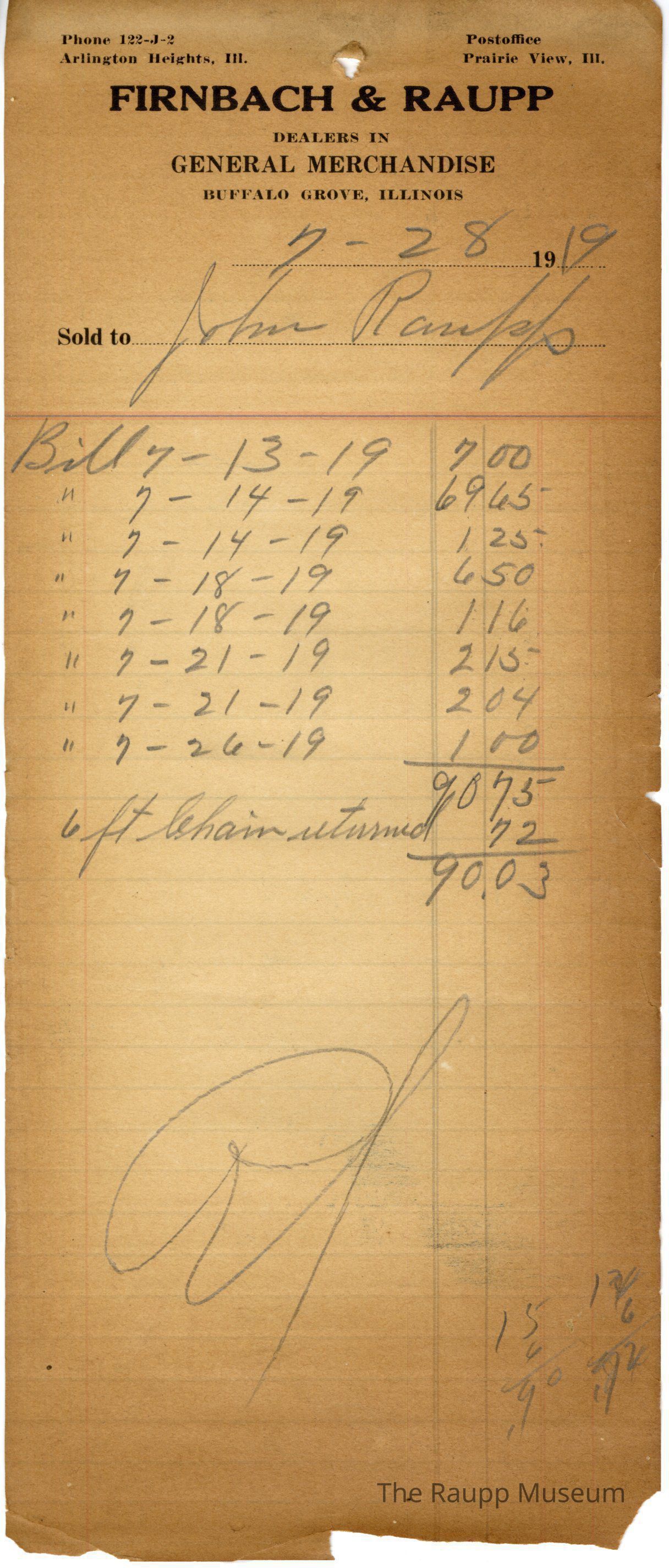 The black text is as follows, from top to bottom: Phone 122-J-2; Postoffice; Arlington Heights, Ill.; Prairie View, Ill.; Firnbach & Raupp; Dealers In; General Merchandise; Buffalo Grove, Illinois; Sold to;Archive Details