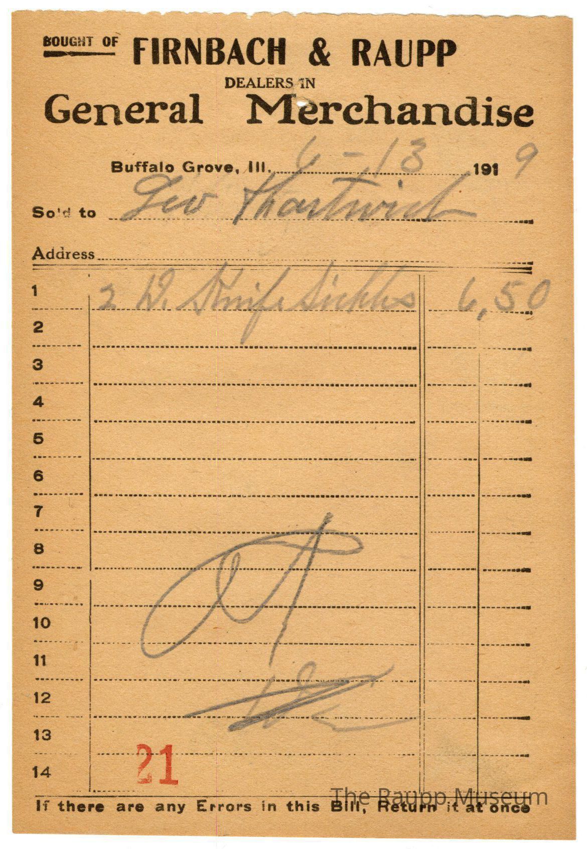 The black text is as follows, from top to bottom: Bought of Firnbach & Raupp, Dealers in GENERAL MERCHANDISE; Buffalo Grove Ill.; Sold to; Address; If there are any Errors in this Bill Return it at once.Archive Details