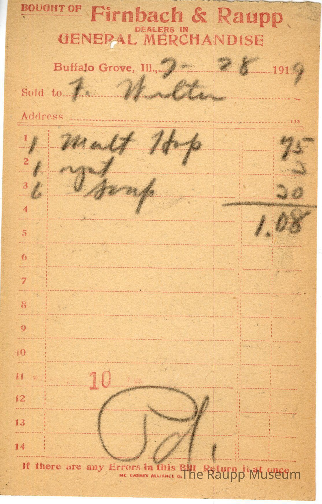 The red text is as follows, from top to bottom: Bought of Firnbach & Raupp; DEALERS IN; GENERAL MERCHANDISE; Buffalo Grove, Ill; Sold to; Address; If there are any Errors in this Bill, Return it at once; Mc Caskey Alliance CoArchive Details
