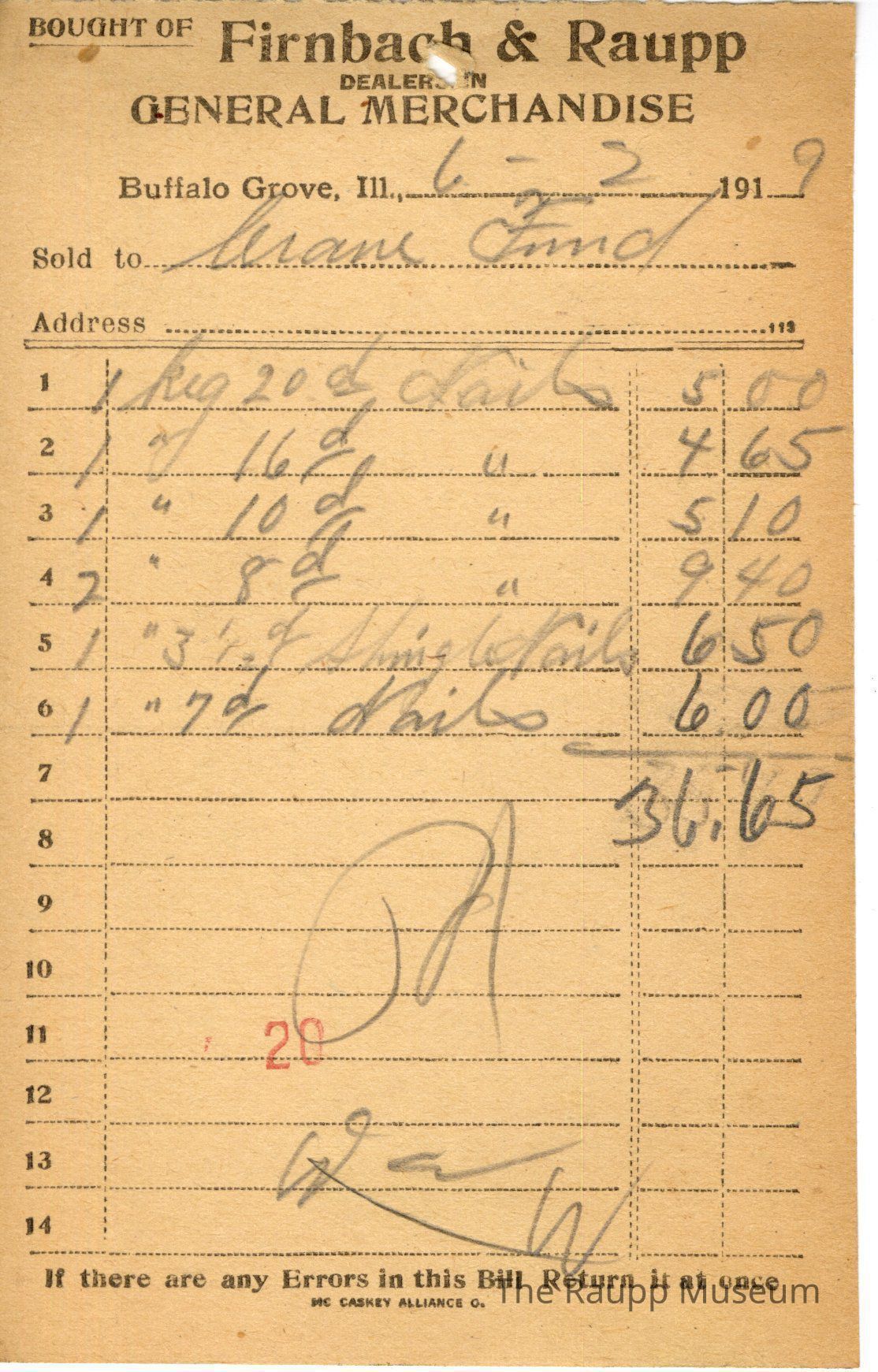 The black text is as follows, from top to bottom: Bought of Firnbach & Raupp; DEALERS IN; GENERAL MERCHANDISE; Buffalo Grove, Ill; Sold to; Address; If there are any Errors in this Bill, Return it at once; Mc Caskey Alliance CoArchive Details
