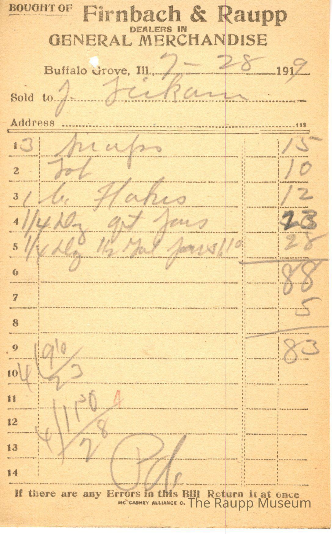 One (1) Firnbach and Raupp store receipt from July 28, 1919. Receipt is rectangular with black printed text and written notes in pencil.