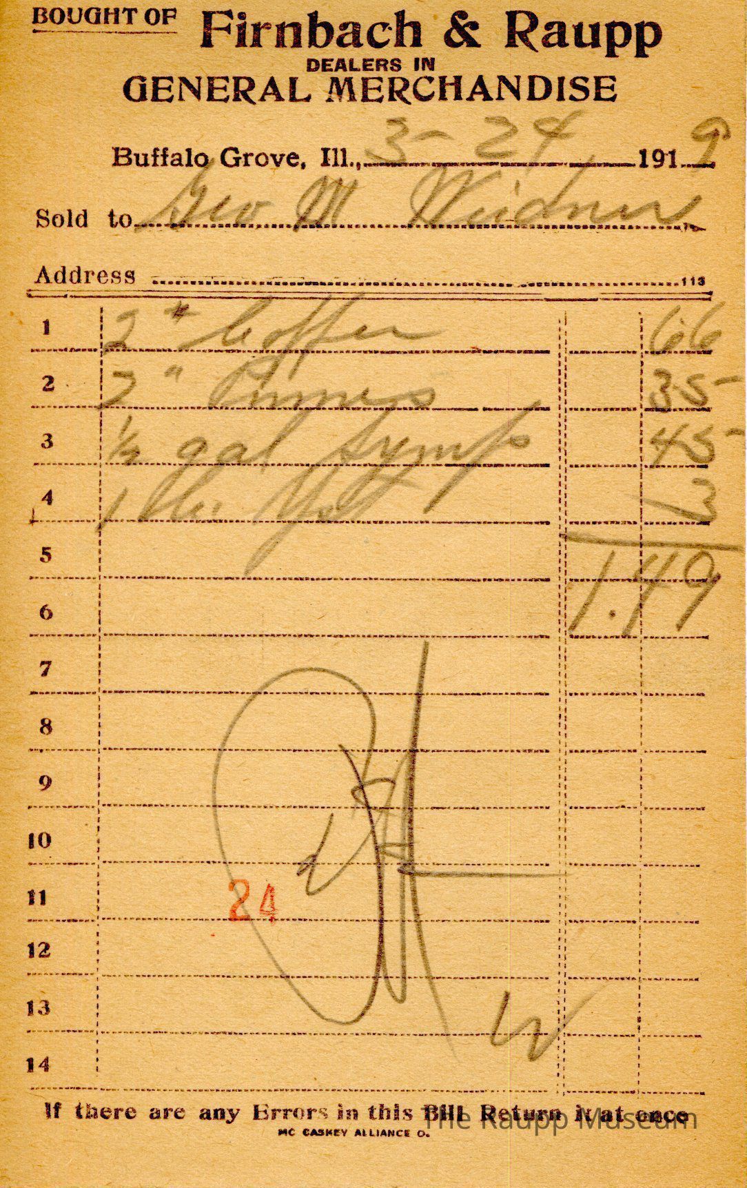 The black text is as follows, from top to bottom: Bought of Firnbach & Raupp; Dealers in GENERAL MERCHANDISE; Buffalo Grove, Ill.,; Sold to; Address; If there are any errors in this bill return it at once; MC Caskey Alliance Co.Archive Details