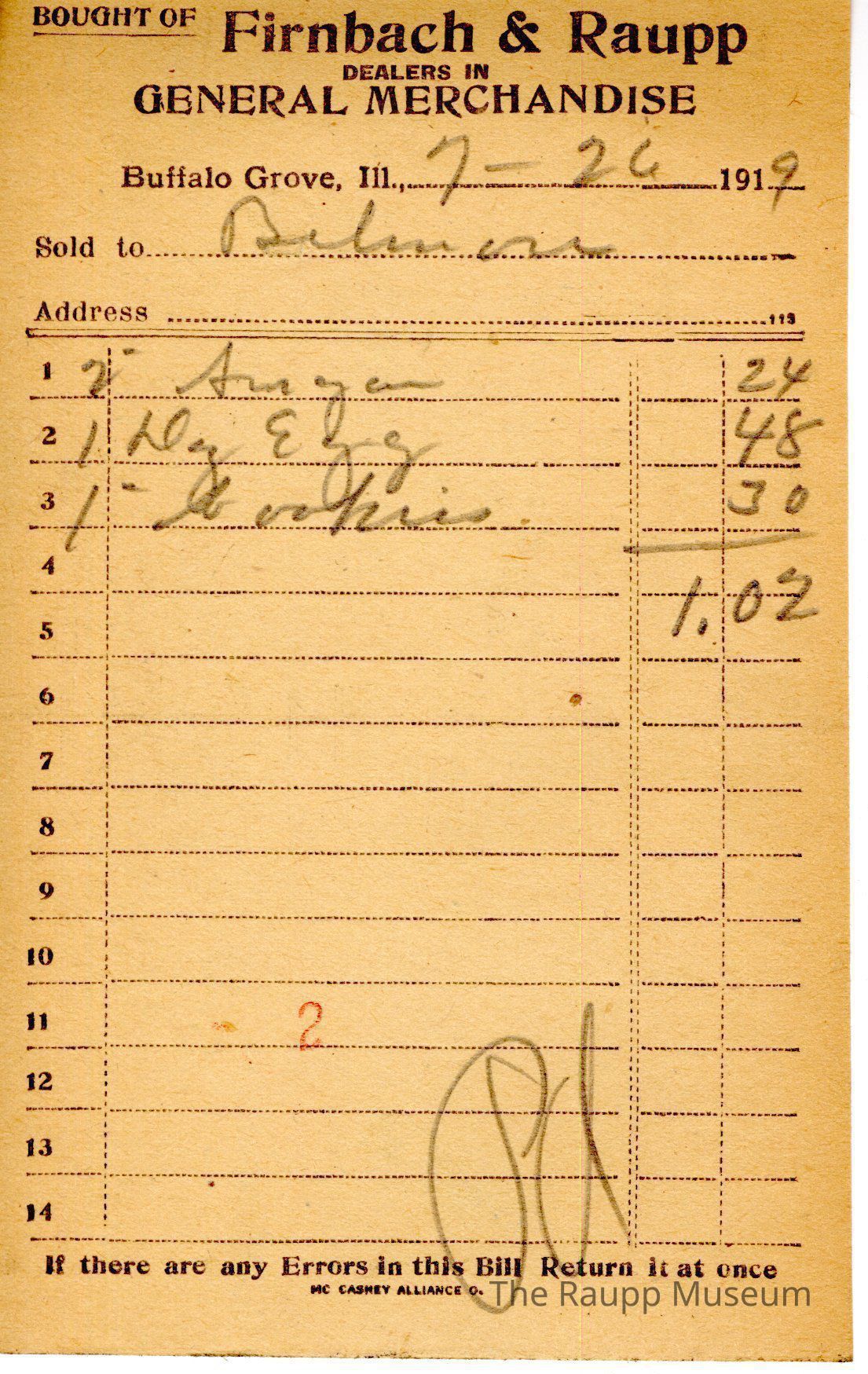 One (1) Firnbach and Raupp store receipt from July 26, 1919. Receipt is rectangular with black printed text and written notes in pencil.