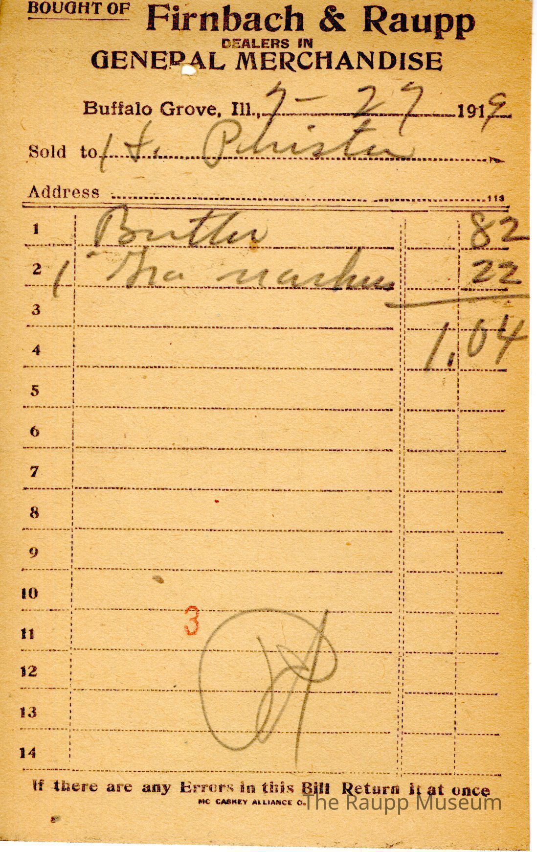 One (1) Firnbach and Raupp store receipt from July 27, 1919. Receipt is rectangular with black printed text and written notes in pencil.