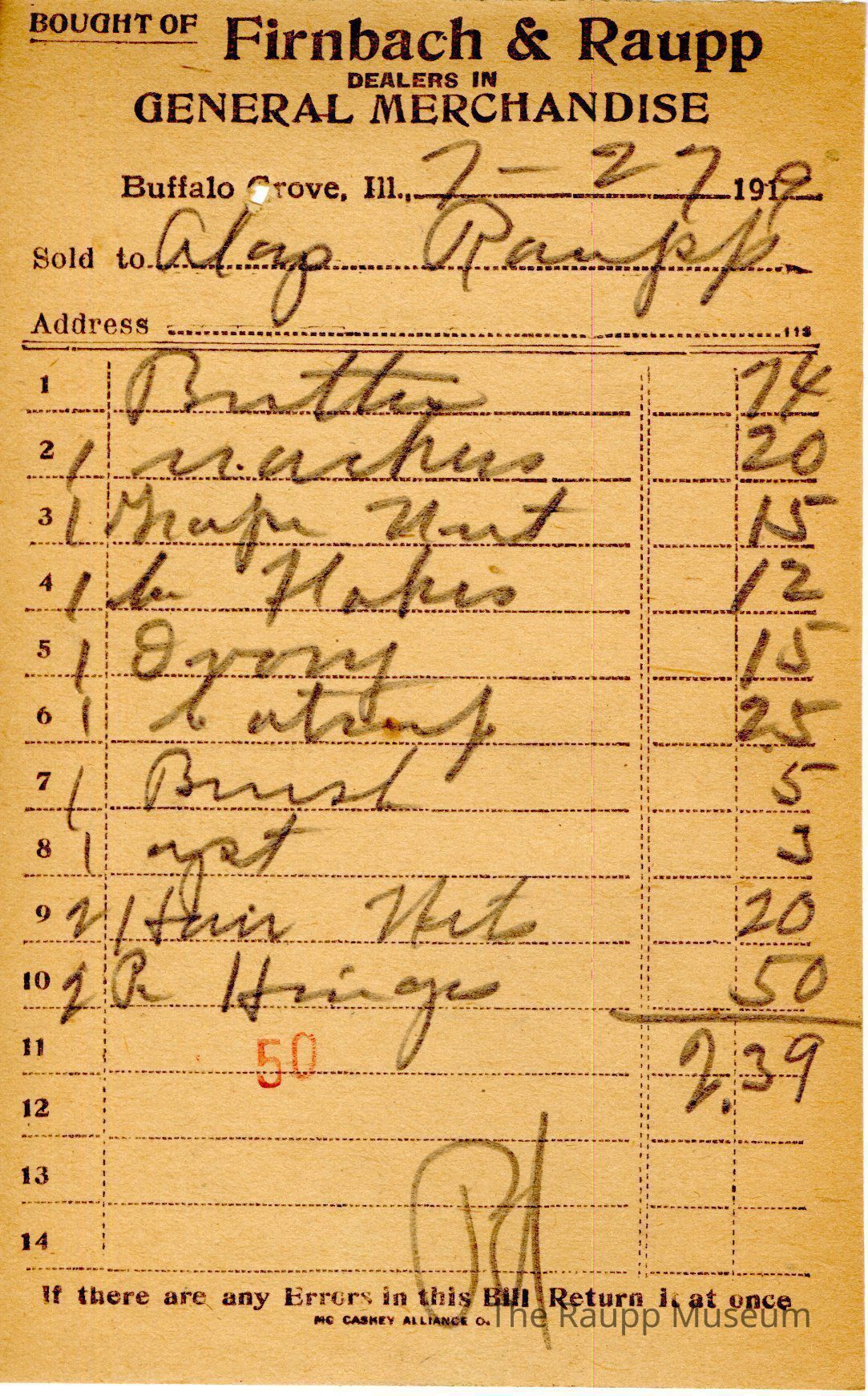The receipt is for Aloys(?) Raupp who bought butter for $0.74, 1 crackers for $0.20, 1 grape nut for $0.15, 1 C. Flakes for $0.12, 1 ivory for $0.15, 1 catsup for $0.25, 1 brush for $0.05, 1 yeast for $0.03, 2 hair nets for $0.20 and 2 pair hinge for $0.50. The bill total was $2.39. The bill is marked as paid, and there is a red stamp of "50" at the bottom of the receipt.