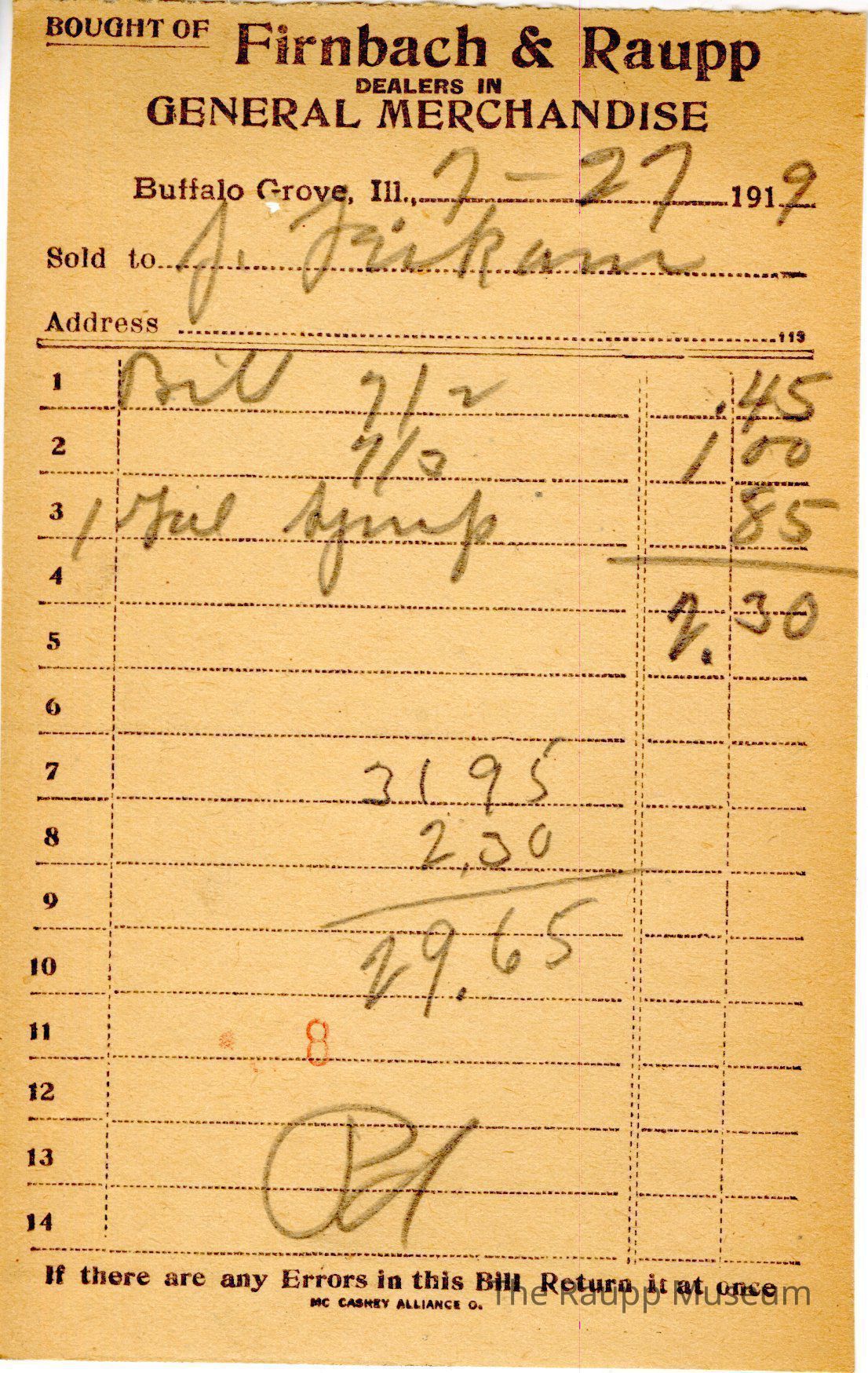 The black text is as follows, from top to bottom: Bought of Firnbach & Raupp; DEALERS IN; GENERAL MERCHANDISE; Buffalo Grove, Ill; Sold to; Address; If there are any Errors in this Bill, Return it at once; Mc Caskey Alliance CoArchive Details