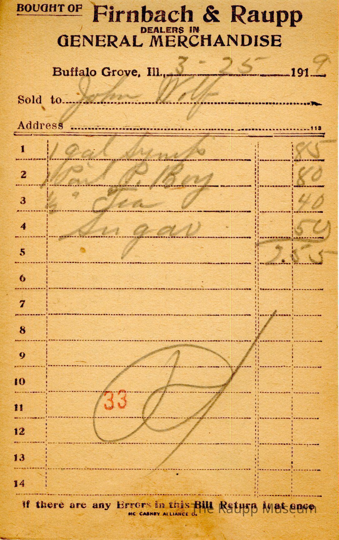 The black printed text is as follows, from top to bottom: Bought of Firnbach & Raupp; Dealers in GENERAL MERCHANDISE; Buffalo Gove. Ill, 191; Sold to; If there are any errors in this Bill Return it at once; MC CASKEY ALLIANCE O.Archive Details