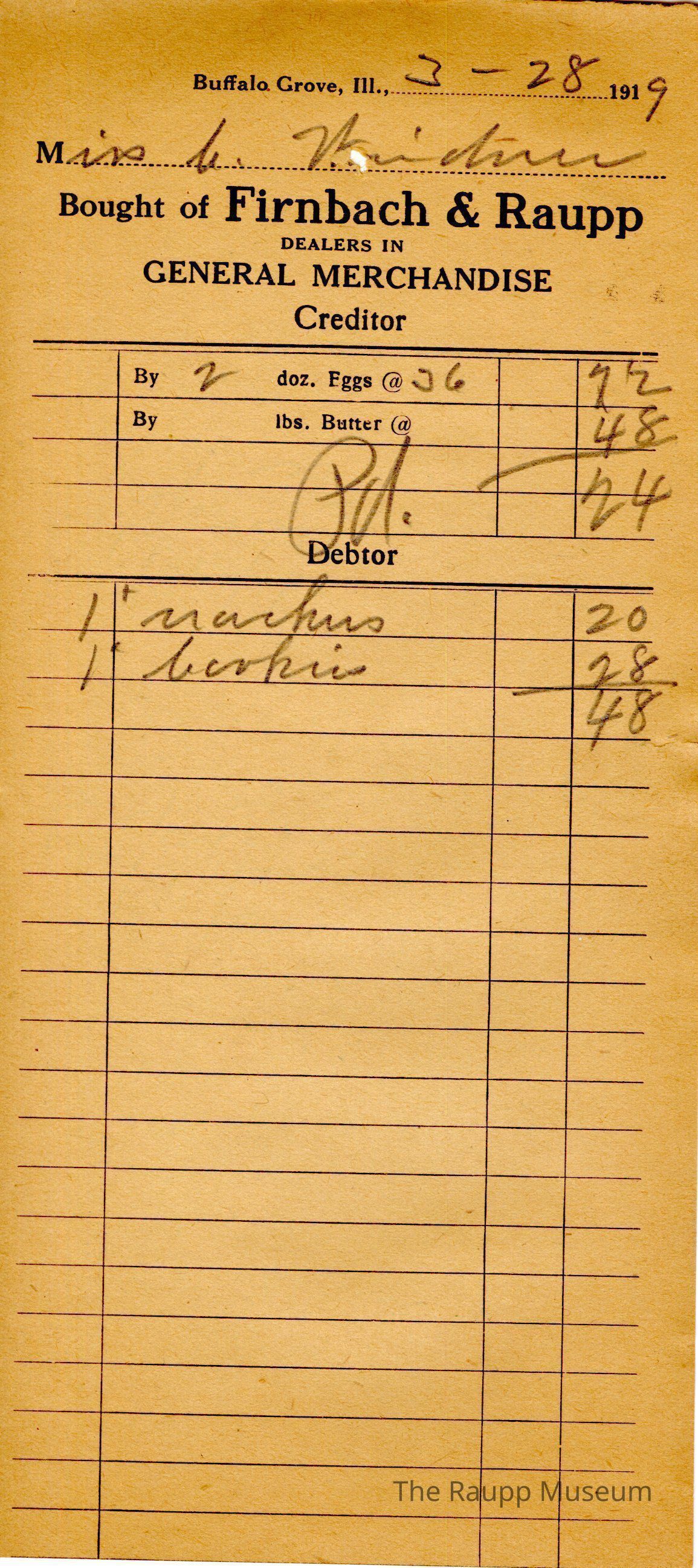 The black printed text is as follows, from top to bottom: Buffalo Gove. Ill, 191; Bought of Firnbach & Raupp; Dealers in GENERAL MERCHANDISE; Creditor; DebtorArchive Details