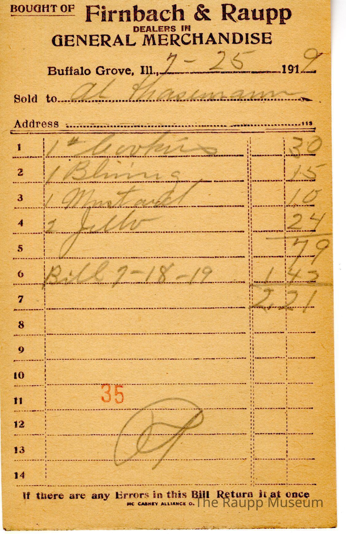 The black text is as follows, from top to bottom: Bought of Firnbach & Raupp; DEALERS IN; GENERAL MERCHANDISE; Buffalo Grove, Ill; Sold to; Address; If there are any Errors in this Bill, Return it at once; Mc Caskey Alliance CoArchive Details