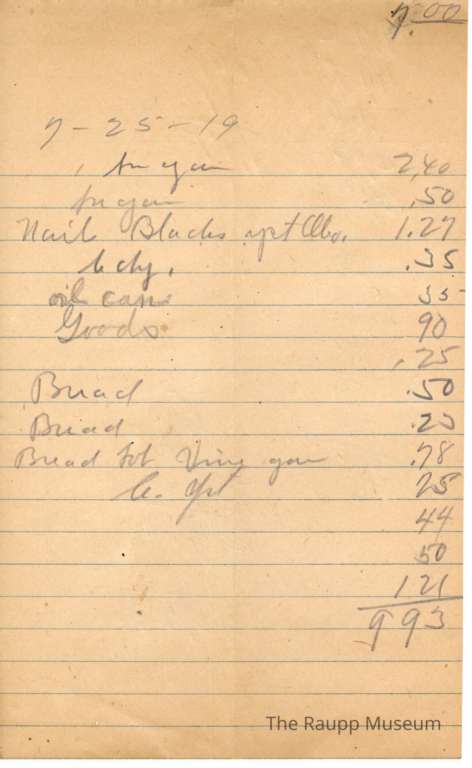 There is no customer named. Sugar is listed for $2.40, nail blacks yeast oleo are listed for $1.27, c cdy. is listed for $0.35, oil can is listed for $0.35, goods is listed for $0.90, (blank line) is listed for $0.25, bread is listed for $0.50, bread is listed for $0.25, bread tab vinegar is listed for $0.78, c. yeast is listed for $0.25, and there are three blank lines listed for $0.44, $0.50 and $1.21. The bill total was $9.93. There is a handwritten "7.00" in the top left corner of the receipt, and there is addition on the back of the receipt.Archive Details