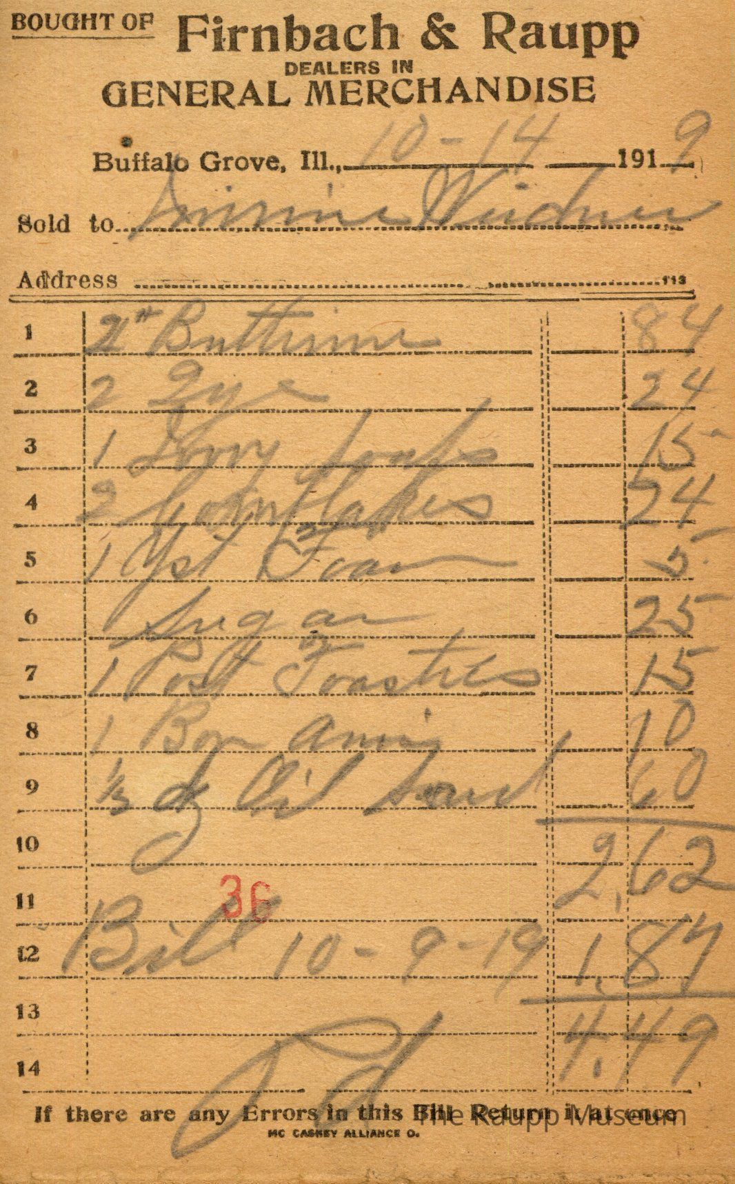 One (1) Firnbach and Raupp store receipt from October 14, 1919. Receipt is rectangular with black printed text and written notes in pencil. The receipt is for Lorimie Weidner, who bought two pounds of butterine for $0.84, two lye for $0.24, one ivory soap for $0.15, two cornflakes for $0.24, one yeast foam for $0.05, sugar for $0.25, one Post Toasties for $0.15, one Bon Ami for $0.10, and one-half dozen of oil sard for $0.60. The customer also paid the bill from October 9th ($1.84), resulting in a grand total of $4.49. The receipt is marked as paid. A red stamp of 36 is located towards the bottom of the page. The text from top to bottom is: BOUGHT OF Firnbach & Raupp; DEALERS IN GENERAL MERCHANDISE; Buffalo Grove, Ill.; Sold to; Address; If there are any Errors in this Bill Return It at once; MC CASKEY ALLIANCE O.Archive Details
