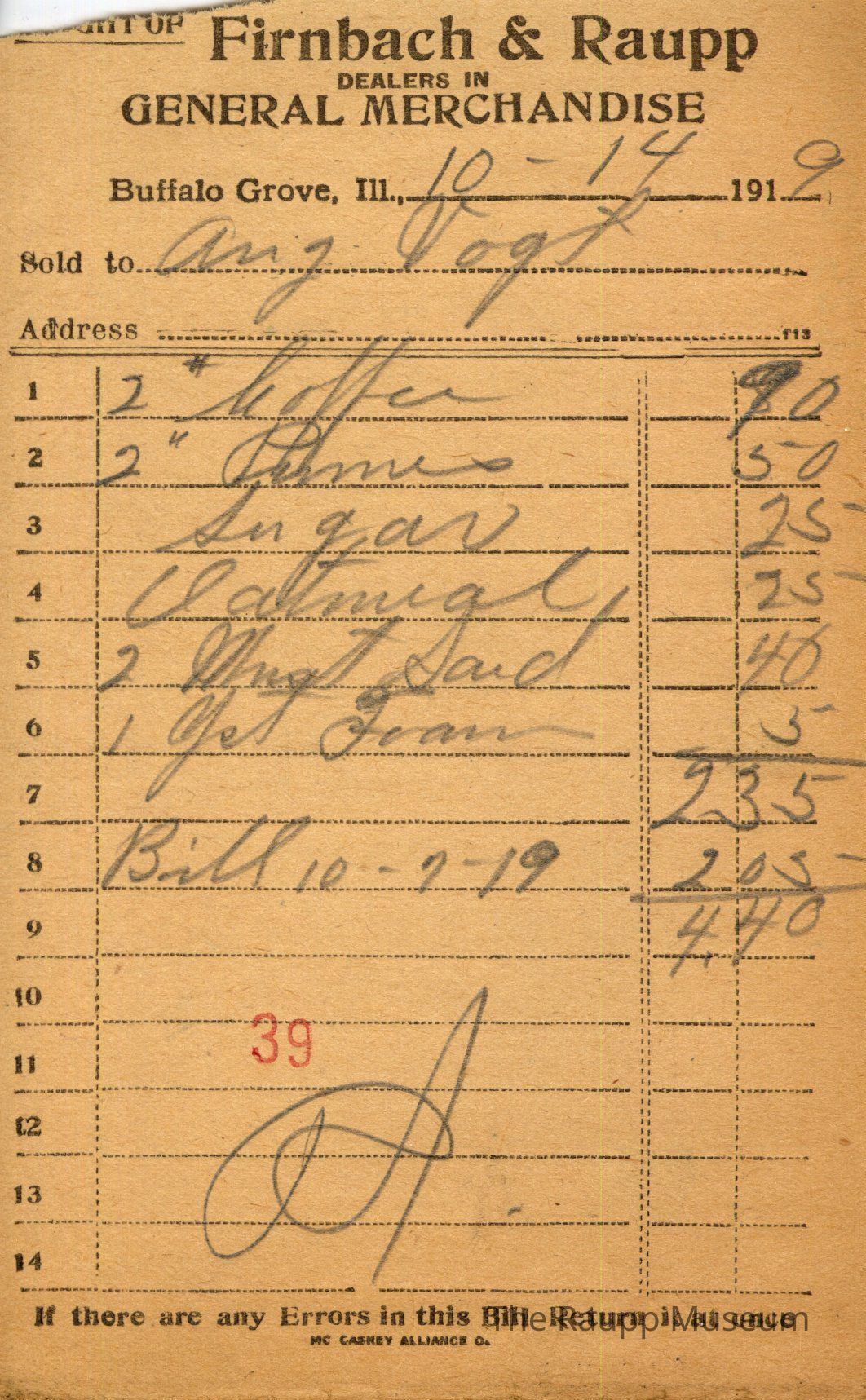 One (1) Firnbach and Raupp store receipt from October 14, 1919. Receipt is rectangular with black printed text and written notes in pencil. The receipt is for Aug Vogt, who bought two pounds of coffee for $0.90, two pounds of prunes for $0.50, sugar for $0.25, oatmeal for $0.25, two Must Sard for $0.40, and one yeast foam for $0.05. The customer also paid the bill from October 9th ($2.05), resulting in a grand total of $4.40. The receipt is marked as paid. A red stamp of 39 is located towards the bottom of the page. The text from top to bottom is: BOUGHT OF Firnbach & Raupp; DEALERS IN GENERAL MERCHANDISE; Buffalo Grove, Ill.; Sold to; Address; If there are any Errors in this Bill Return It at once; MC CASKEY ALLIANCE O.Archive Details