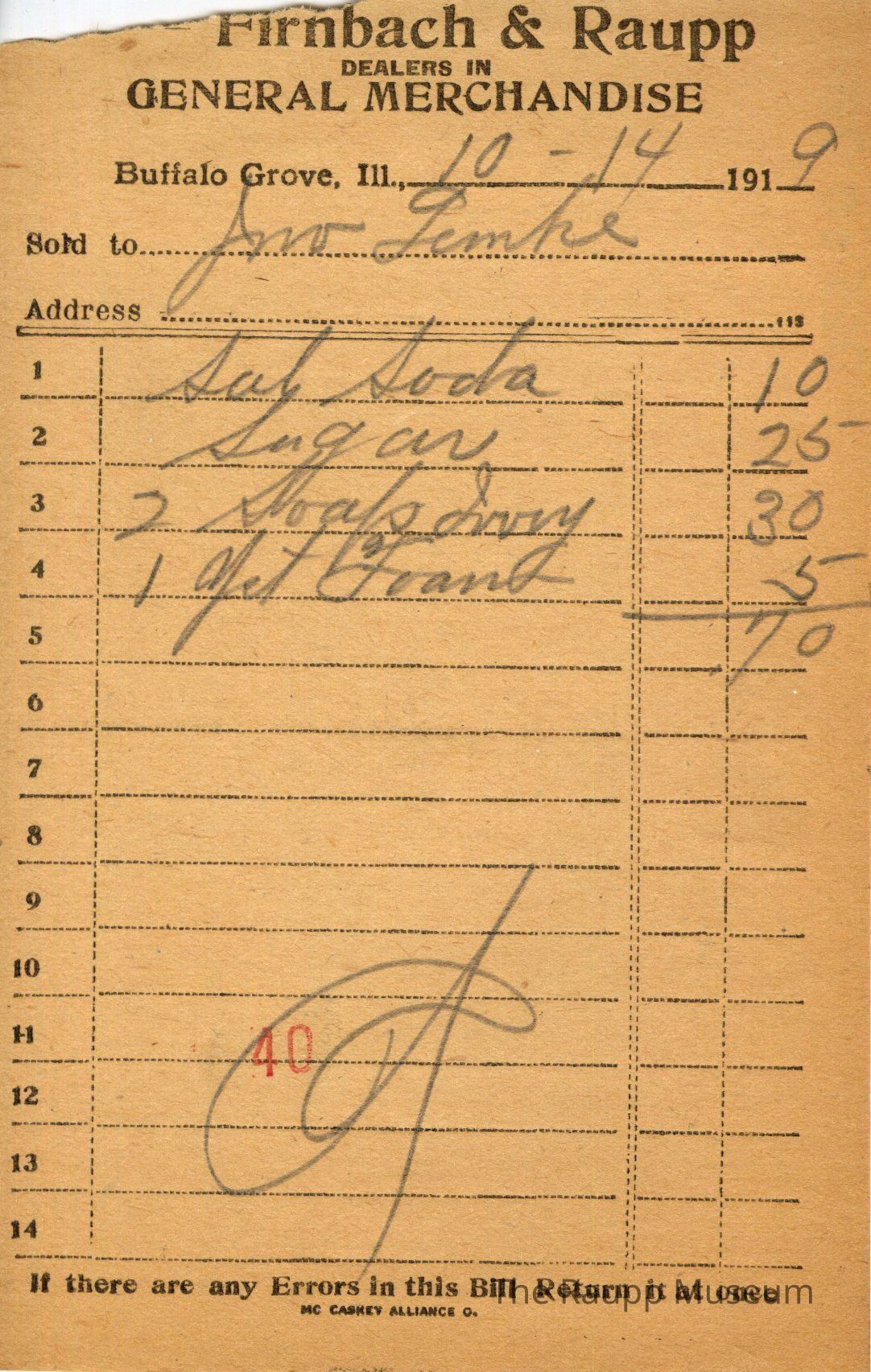 One (1) Firnbach and Raupp store receipt from October 14, 1919. Receipt is rectangular with black printed text and written notes in pencil. The receipt is for Jon Lemke, who bought Sal Soda for $0.10, sugar for $0.25, two soap ivory for $0.30, and one yeast foam for $0.05. The total is $0.70 and the receipt is marked as paid. A red stamp of 40 is located towards the bottom of the page. The text from top to bottom is: BOUGHT OF Firnbach & Raupp; DEALERS IN GENERAL MERCHANDISE; Buffalo Grove, Ill.; Sold to; Address; If there are any Errors in this Bill Return It at once; MC CASKEY ALLIANCE O.Archive Details