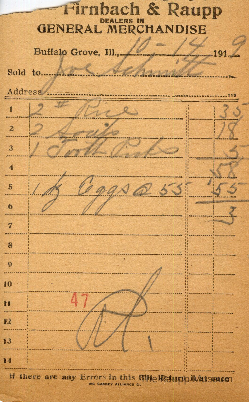 One (1) Firnbach and Raupp store receipt from October 14, 1919. Receipt is rectangular with black printed text and written notes in pencil. The receipt is for Joe Schmitt, who bought two pounds of rice for $0.35, two soaps for $0.18, and one toothpicks for $0.05. The customer also sold one dozen of eggs at $0.55 per dozen to the store. The total is $0.03 and the receipt is marked as paid. A red stamp of 47 is located towards the bottom of the page. The text from top to bottom is: BOUGHT OF Firnbach & Raupp; DEALERS IN GENERAL MERCHANDISE; Buffalo Grove, Ill.; Sold to; Address; If there are any Errors in this Bill Return It at once; MC CASKEY ALLIANCE O.Archive Details