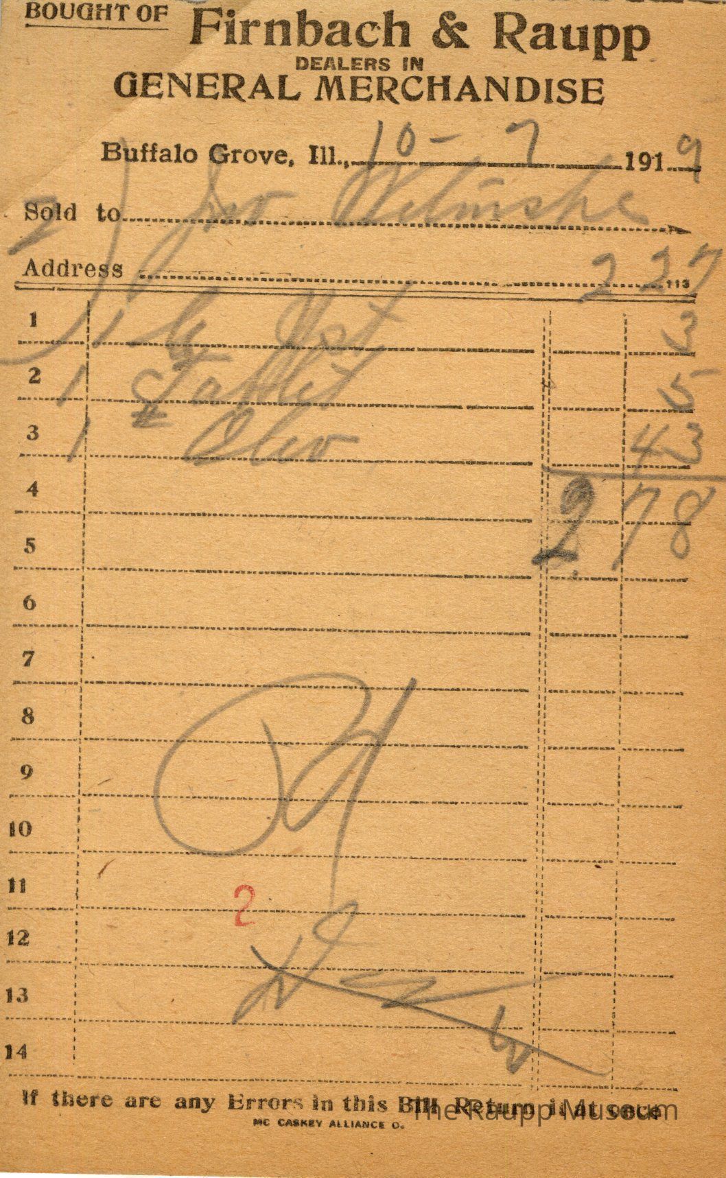 One (1) Firnbach and Raupp store receipt from October 7, 1919. Receipt is rectangular with black printed text and written notes in pencil. The receipt is for Jon Welinske, who bought one box of yeast for $0.03, one tablet for $0.05, and one pound of oleo for $0.43. Another $2.27 was added to the bill for a total of $2.78. The receipt is marked as paid. A red stamp of 2 is located towards the bottom of the page. The text from top to bottom is: BOUGHT OF Firnbach & Raupp; DEALERS IN GENERAL MERCHANDISE; Buffalo Grove, Ill.; Sold to; Address; If there are any Errors in this Bill Return It at once; MC CASKEY ALLIANCE O.Archive Details