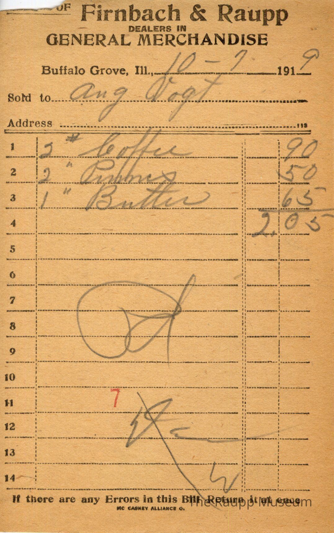 One (1) Firnbach and Raupp store receipt from October 7, 1919. Receipt is rectangular with black printed text and written notes in pencil. The receipt is for Aug Vogt, who bought two pounds of coffee for $0.90, two pounds of prunes for $0.50, and one pound of butter for $0.65. The total is $2.05 and the receipt is marked as paid. A red stamp of 7 is located towards the bottom of the page. The text from top to bottom is: BOUGHT OF Firnbach & Raupp; DEALERS IN GENERAL MERCHANDISE; Buffalo Grove, Ill.; Sold to; Address; If there are any Errors in this Bill Return It at once; MC CASKEY ALLIANCE O.Archive Details