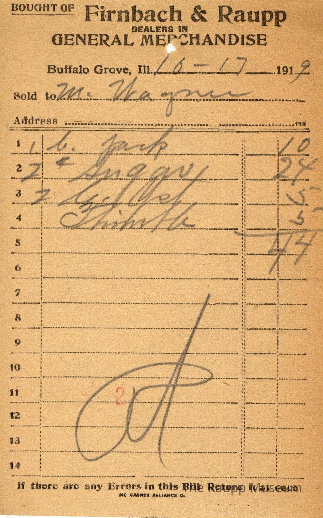 One (1) Firnbach and Raupp store receipt from October 17, 1919. Receipt is rectangular with black printed text and written notes in pencil. The receipt is for M. Wagner, who bought one b. jack for $0.10, two pounds of sugar for $0.24, one b. yeast for $0.05, and thimble for $0.05. The total is $0.44 and the receipt is marked as paid. A red stamp of 2 is located towards the bottom of the page. The text from top to bottom is: BOUGHT OF Firnbach & Raupp; DEALERS IN GENERAL MERCHANDISE; Buffalo Grove, Ill.; Sold to; Address; If there are any Errors in this Bill Return It at once; MC CASKEY ALLIANCE O.Archive Details