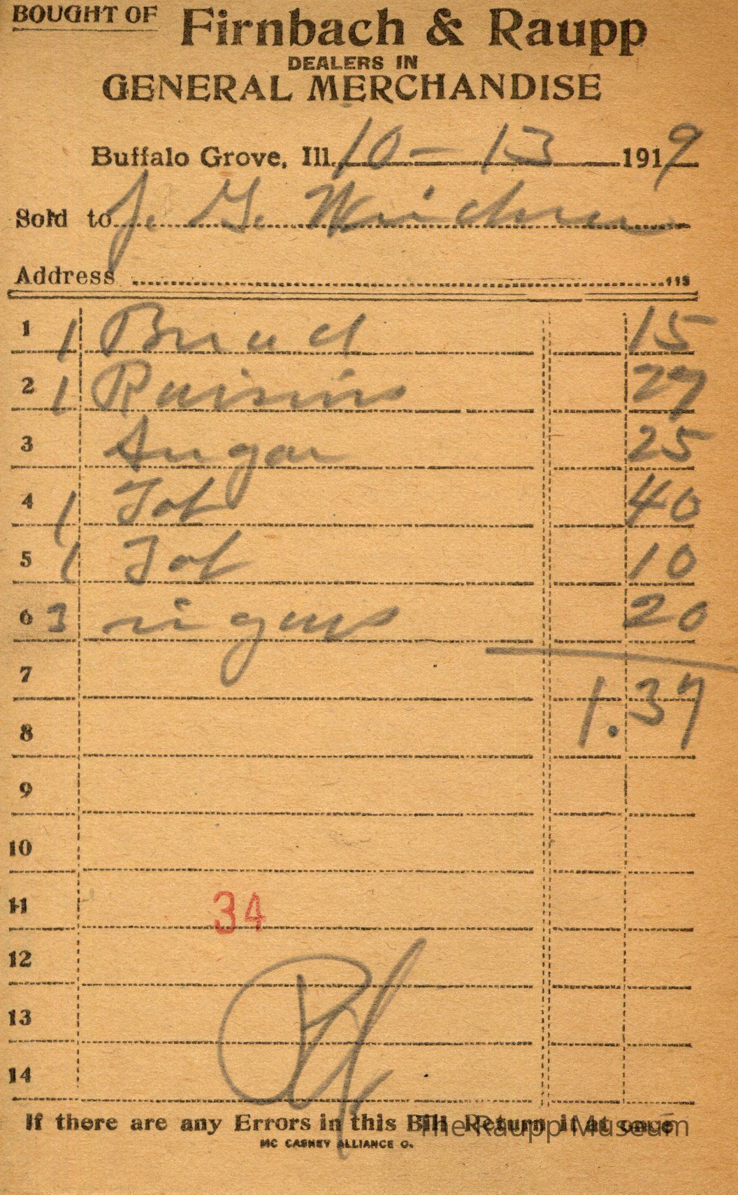 One (1) Firnbach and Raupp store receipt from October 13, 1919. Receipt is rectangular with black printed text and written notes in pencil. The receipt is for J. G. Weidner, who bought one bread for $0.15, one raisins for $0.27, sugar for $0.25, one jol (?) for $0.40, one jol (?) for $0.10, and three cigars for $0.20. The total is $1.37 and the receipt is marked as paid. A red stamp of 34 is located towards the bottom of the page. The text from top to bottom is: BOUGHT OF Firnbach & Raupp; DEALERS IN GENERAL MERCHANDISE; Buffalo Grove, Ill.; Sold to; Address; If there are any Errors in this Bill Return It at once; MC CASKEY ALLIANCE O.Archive Details