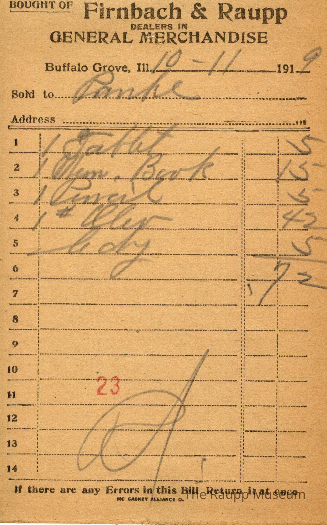 One (1) Firnbach and Raupp store receipt from October 11, 1919. Receipt is rectangular with black printed text and written notes in pencil. The receipt is for Panke (?), who bought one tablet for $0.05, one Mem. book for $0.15, one pencil for $0.05, one pound of oleo for $0.42, and c. dry (?) for $0.05. The total is $0.72 and the receipt is marked as paid. A red stamp of 23 is located towards the bottom of the page. The text from top to bottom is: BOUGHT OF Firnbach & Raupp; DEALERS IN GENERAL MERCHANDISE; Buffalo Grove, Ill.; Sold to; Address; If there are any Errors in this Bill Return It at once; MC CASKEY ALLIANCE O.Archive Details