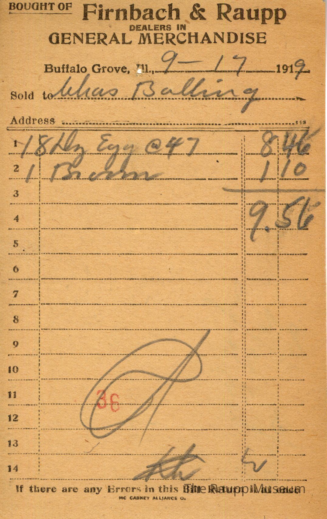 One (1) Firnbach and Raupp store receipt from September 17, 1919. Receipt is rectangular with black printed text and written notes in pencil. The receipt is for Lehas Balling, who bought eighteen dozens of eggs at $0.47 per dozen for $8.46 and one broom for $1.10. The total is $9.56 and the receipt is marked as paid. A red stamp of 36 is located towards the bottom of the page. The text from top to bottom is: BOUGHT OF Firnbach & Raupp; DEALERS IN GENERAL MERCHANDISE; Buffalo Grove, Ill.; Sold to; Address; If there are any Errors in this Bill Return It at once; MC CASKEY ALLIANCE O.Archive Details