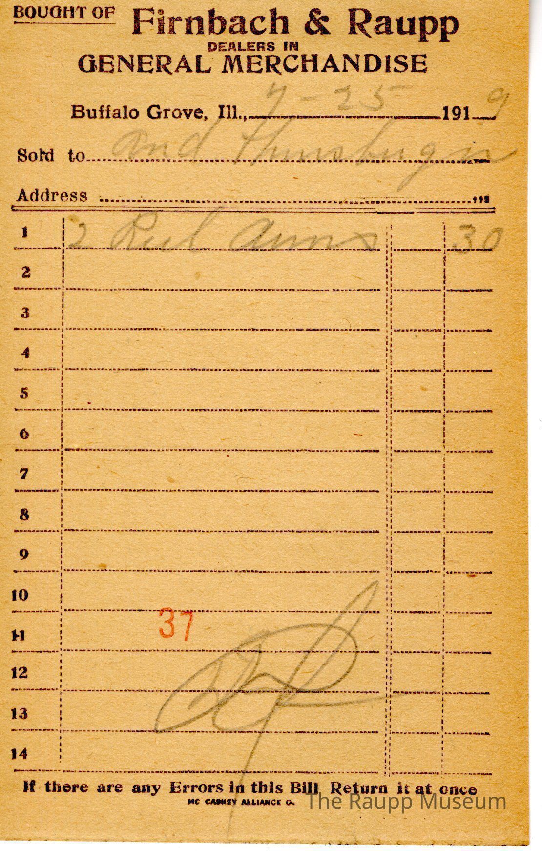 The black text is as follows, from top to bottom: Bought of Firnbach & Raupp; DEALERS IN; GENERAL MERCHANDISE; Buffalo Grove, Ill; Sold to; Address; If there are any Errors in this Bill, Return it at once; Mc Caskey Alliance CoArchive Details
