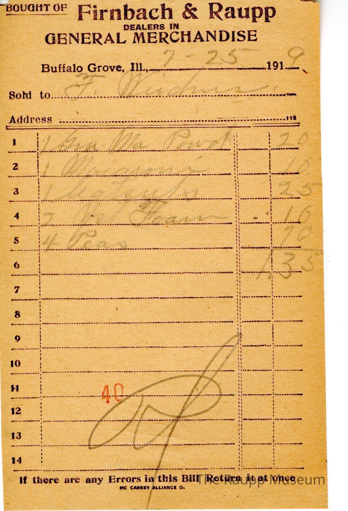 One (1) Firnbach and Raupp store receipt from July 25, 1919. Receipt is rectangular with black printed text and written notes in pencil.