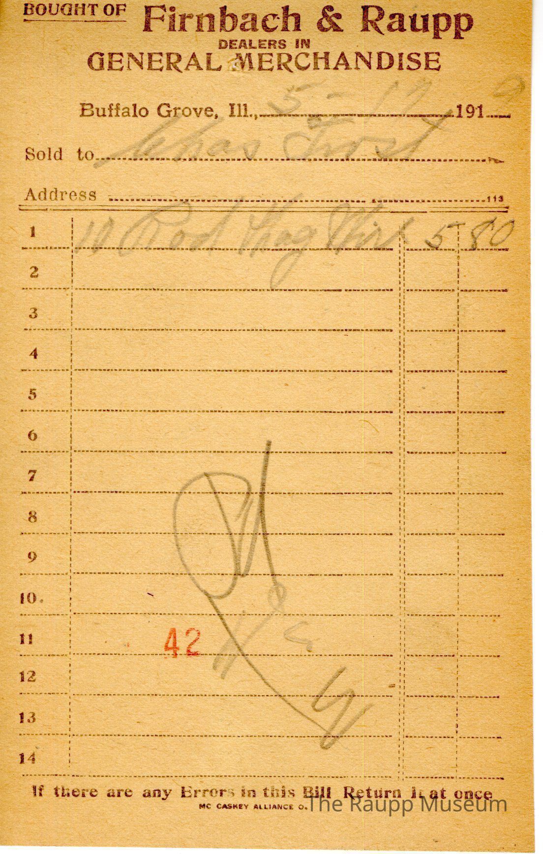 The black text is as follows, from top to bottom: Bought of Firnbach & Raupp; DEALERS IN; GENERAL MERCHANDISE; Buffalo Grove, Ill; Sold to; Address; If there are any Errors in this Bill, Return it at once; Mc Caskey Alliance CoArchive Details