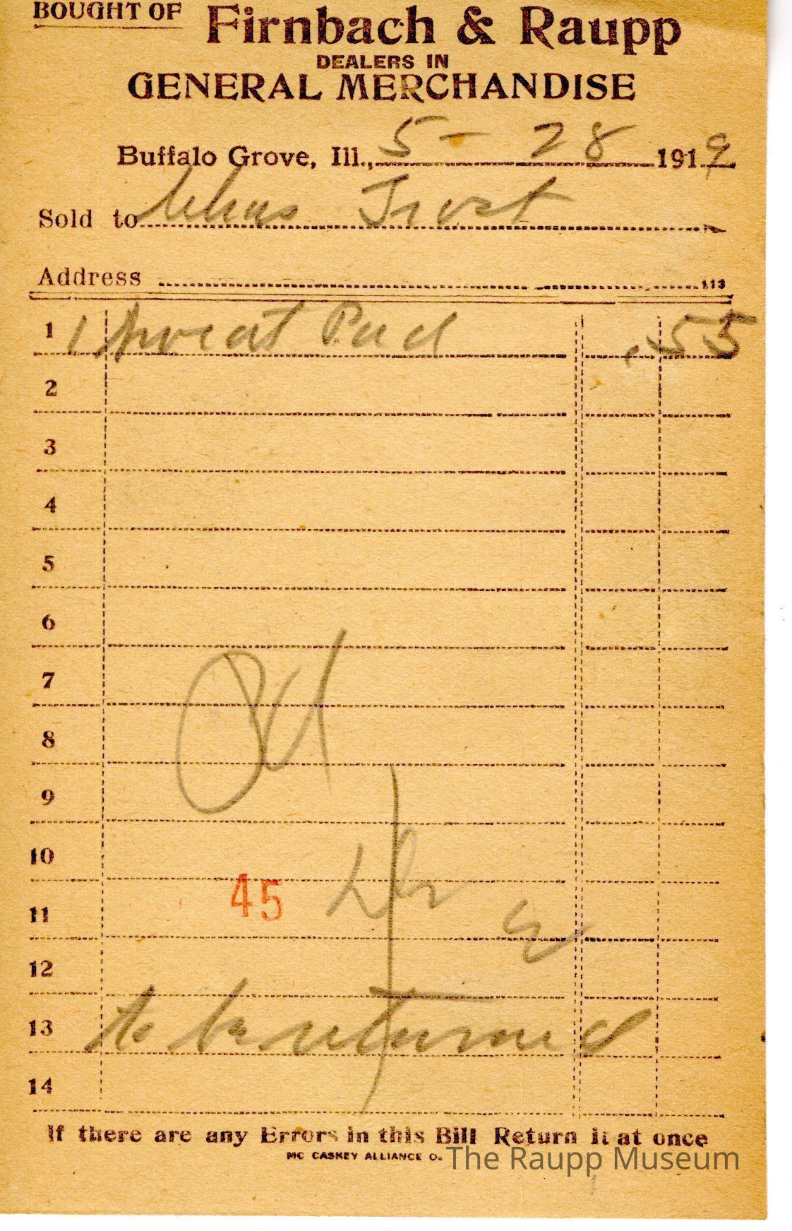 The black text is as follows, from top to bottom: Bought of Firnbach & Raupp; DEALERS IN; GENERAL MERCHANDISE; Buffalo Grove, Ill; Sold to; Address; If there are any Errors in this Bill, Return it at once; Mc Caskey Alliance CoArchive Details