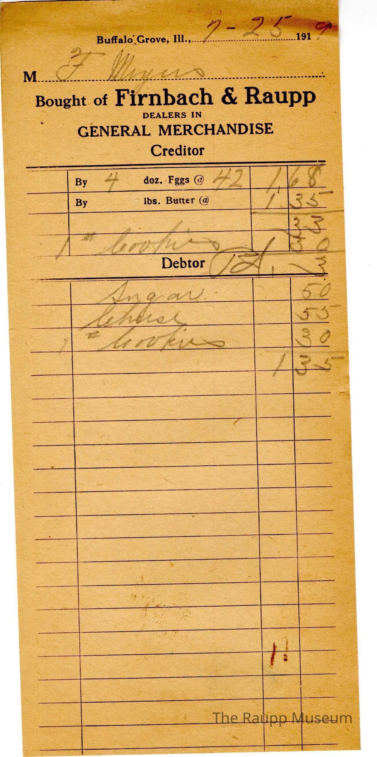 The black text is as follows, from top to bottom: Buffalo Grove, Ill.,; M; Bought of Firnbach & Raupp; DEALERS IN; GENERAL MERCHANDISE; Creditor; By doz. Eggs @; By lbs. Butter @; DebtorArchive Details