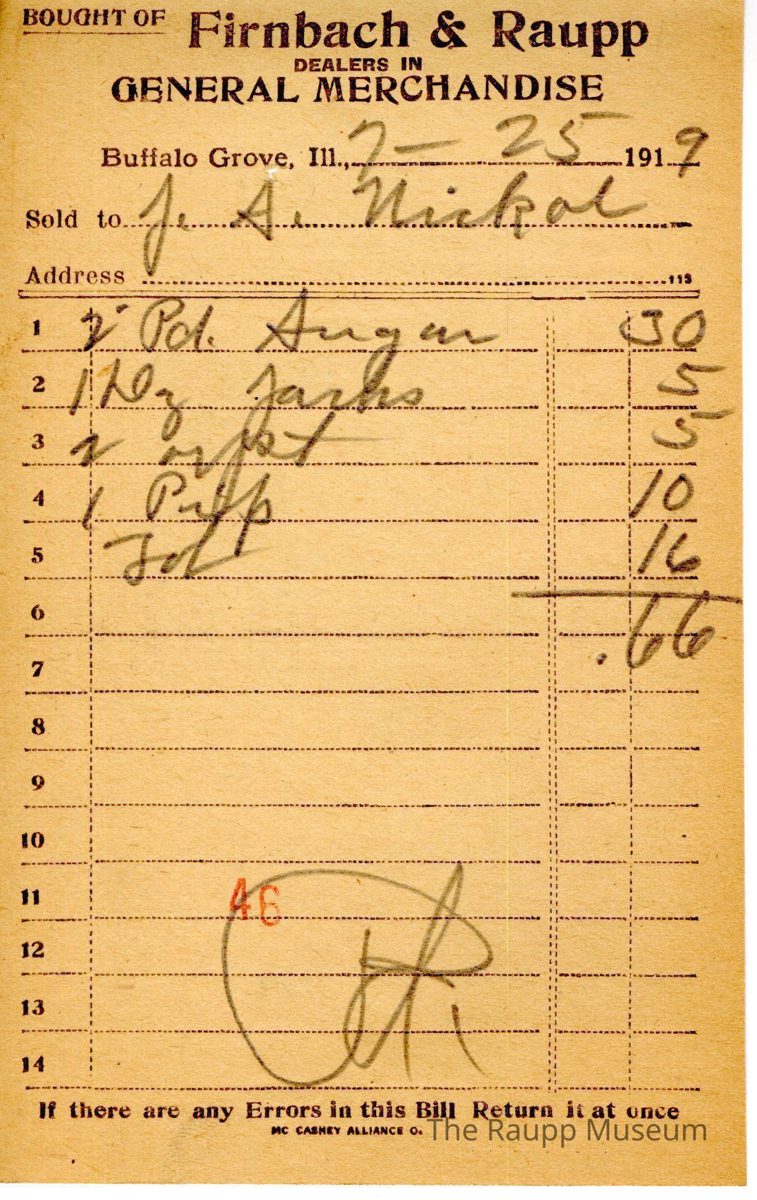The black text is as follows, from top to bottom: Bought of Firnbach & Raupp; DEALERS IN; GENERAL MERCHANDISE; Buffalo Grove, Ill; Sold to; Address; If there are any Errors in this Bill, Return it at once; Mc Caskey Alliance CoArchive Details