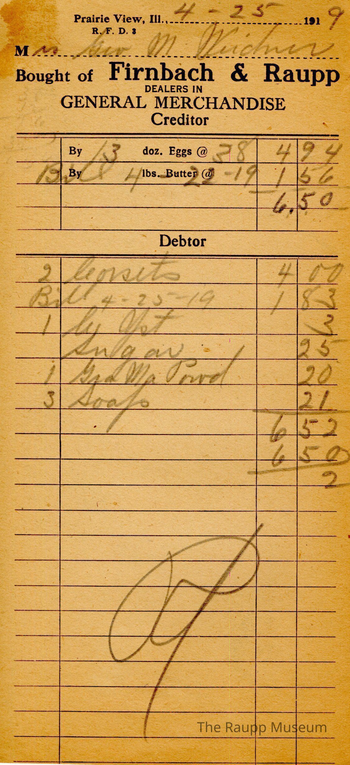 The black text is as follows, from top to bottom: Prairie View, Ill.,; Bought of Firnbach & Raupp; Dealers in GENERAL MERCHANDISE Creditor; By doz. Eggs @; By lbs Butter @; Debtor.Archive Details