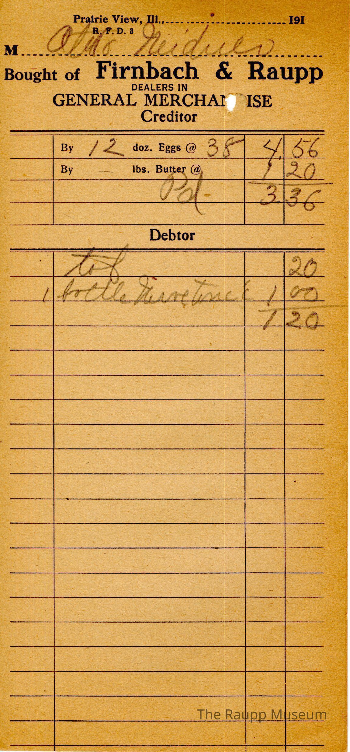 The black text is as follows, from top to bottom: Prairie View, Ill.,; Bought of Firnbach & Raupp; Dealers in GENERAL MERCHANDISE Creditor; By doz. Eggs @; By lbs Butter @; Debtor.Archive Details