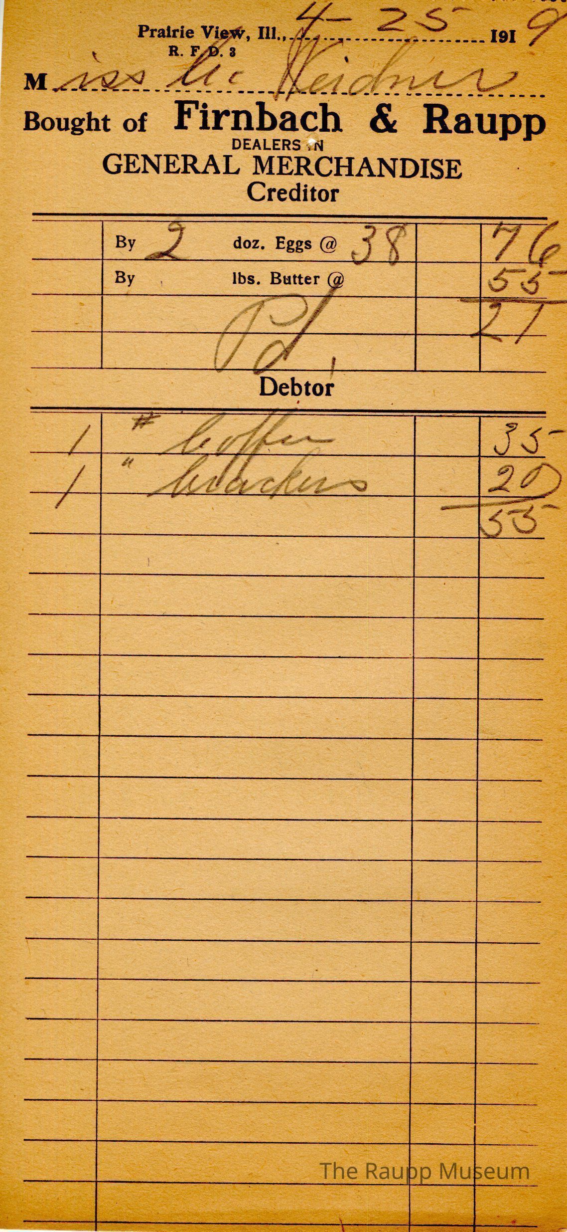 The black text is as follows, from top to bottom: Prairie View, Ill.,; Bought of Firnbach & Raupp; Dealers in GENERAL MERCHANDISE Creditor; By doz. Eggs @; By lbs Butter @; Debtor.Archive Details