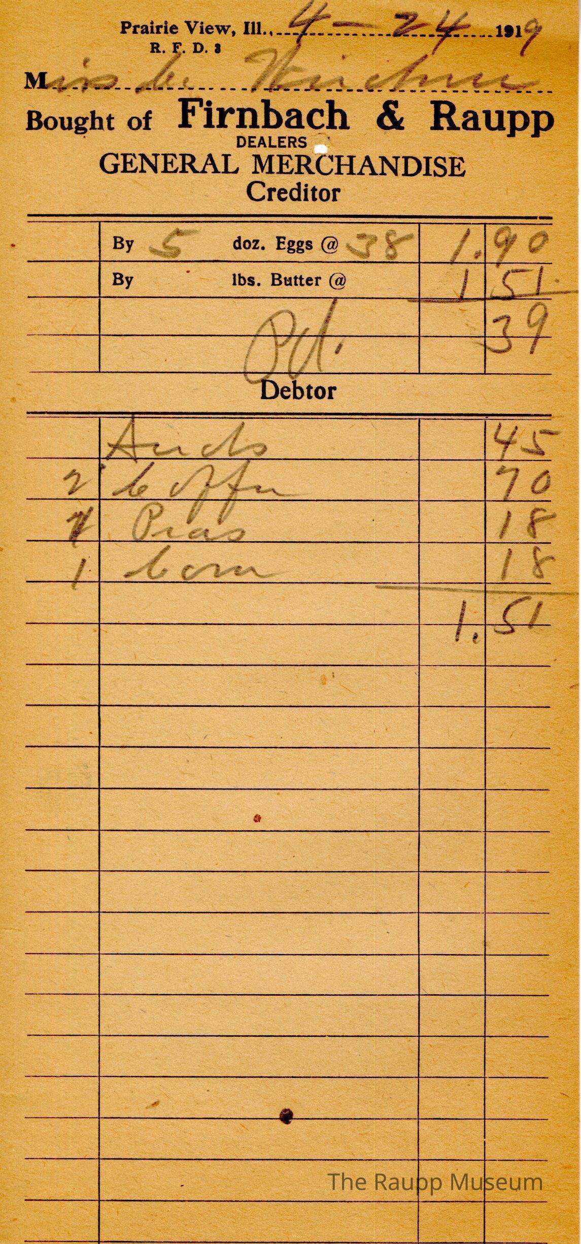 The black text is as follows, from top to bottom: Prairie View, Ill.,; Bought of Firnbach & Raupp; Dealers in GENERAL MERCHANDISE Creditor; By doz. Eggs @; By lbs Butter @; Debtor.Archive Details