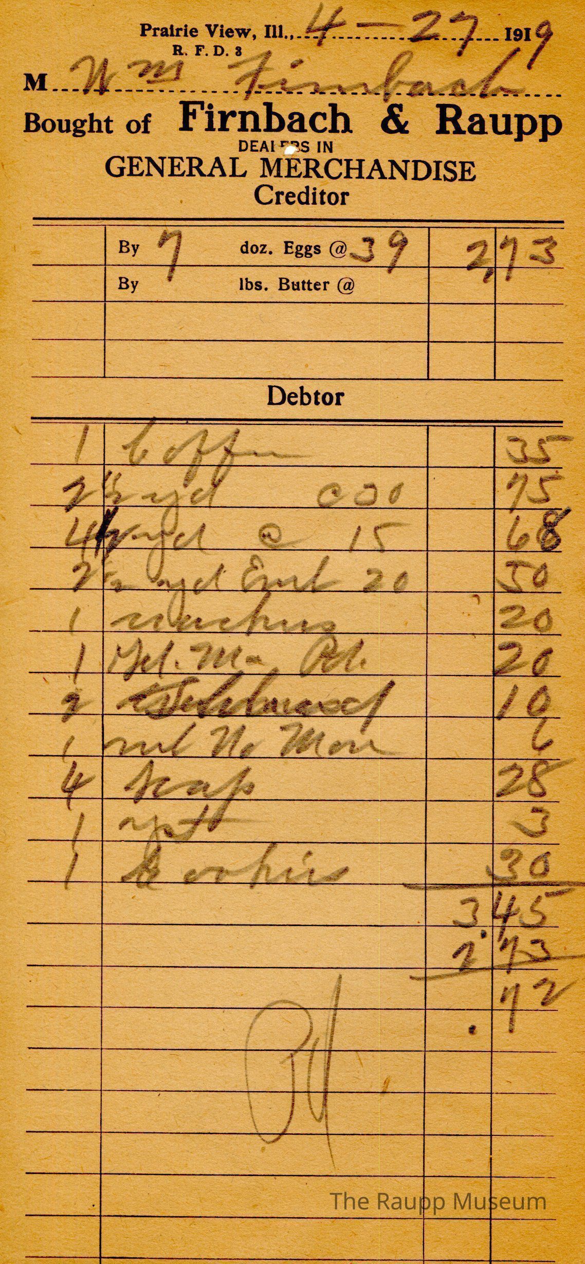 One (1) Firnbach and Raupp store receipt from Aril 27, 1919. Receipt is rectangular with black printed text and written notes in pencil. The receipt is for William Firnbach, who sold 7 dozen eggs at $0.39 for $2.73. He bought 1 coffee for $0.35, 2 1/12 yd @ $0.30 for $0.75, 4 1/2 yd @ $0.15 for $0.68, 2 1/2 yd for $0.50, 1 crackers for $0.20, 1 Gd. Ma. powder, 2 for $0.10, 1 Rub No More for $0.06, 4 soap for $0.28, 1 yst for $0.03, and 1 cookies for $0.30. Bill total was $3.45, from which $2.73 was subtracted for a bill total of $0.72. The bill is marked as paid. There is math written on the back.